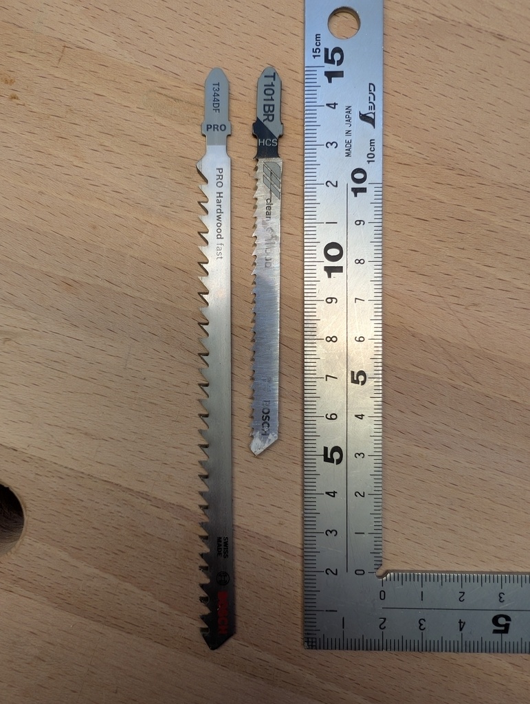J'ai reçu mes lames de scie sauteuse. C'est beaucoup mieux avec. Néanmoins, scier du massif de 35 mm à la scie sauteuse, c'est assez long. Mais j'ai maintenant mes 6 pièces de massif prêtes pour l'usinage.
