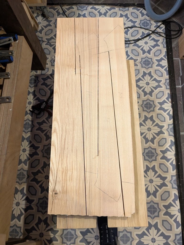Le premier défi de cette réalisation, c'est de travailler à partir de bois brut. Jusqu'à présent, je travaillais avec du bois déjà dégauchi/raboté (des planches en chêne, hêtre ou sapin de GSB ou du bois de meilleure qualité en provenance de chez Deboisec.