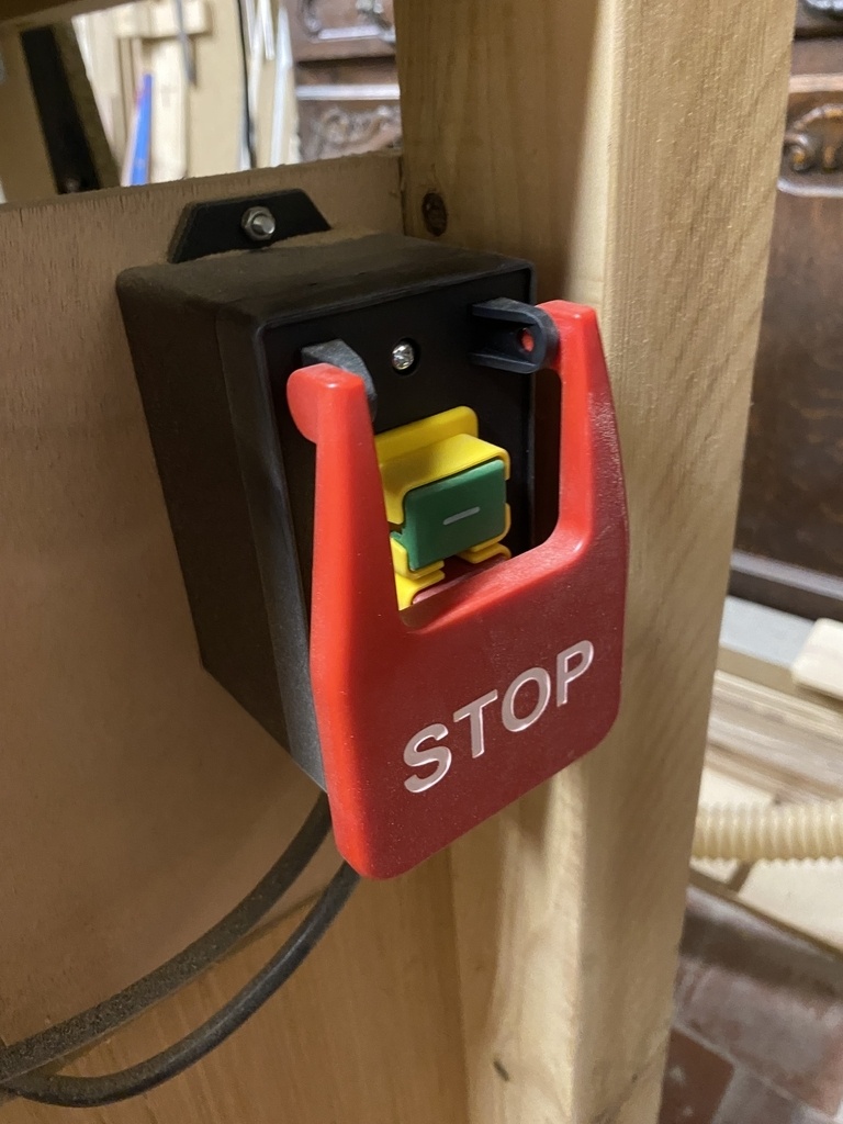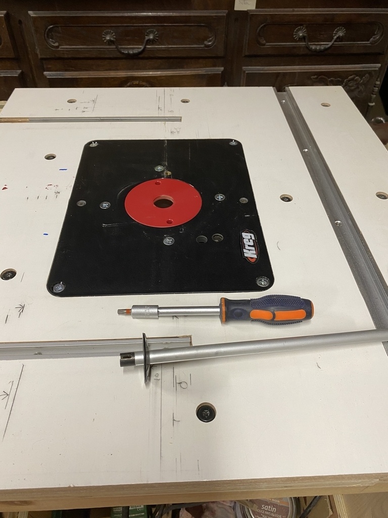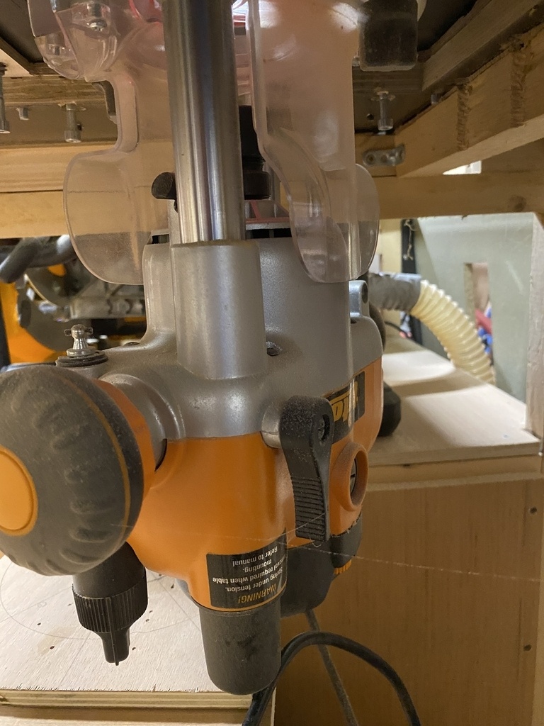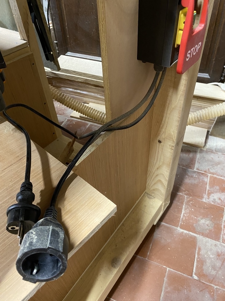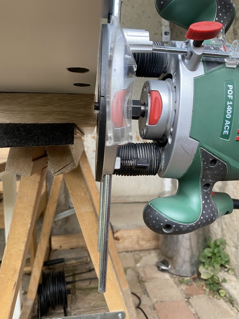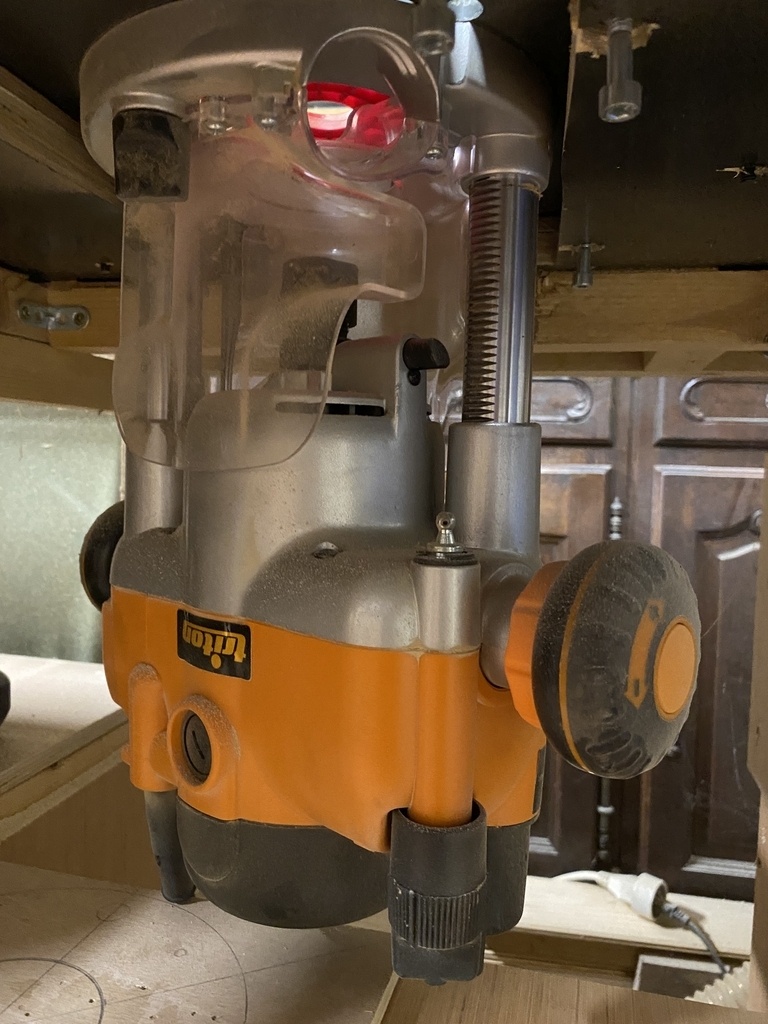 Je me suis également monté une défonceuse sous table, ce qui à mon avis est ce qui se fait de mieux en la matière pour le moment, c'est la plus puissante de chez TRITON, idéale pour installer sous table ; avec tous les systèmes de sécurité que j'ai ajoutés à la table .