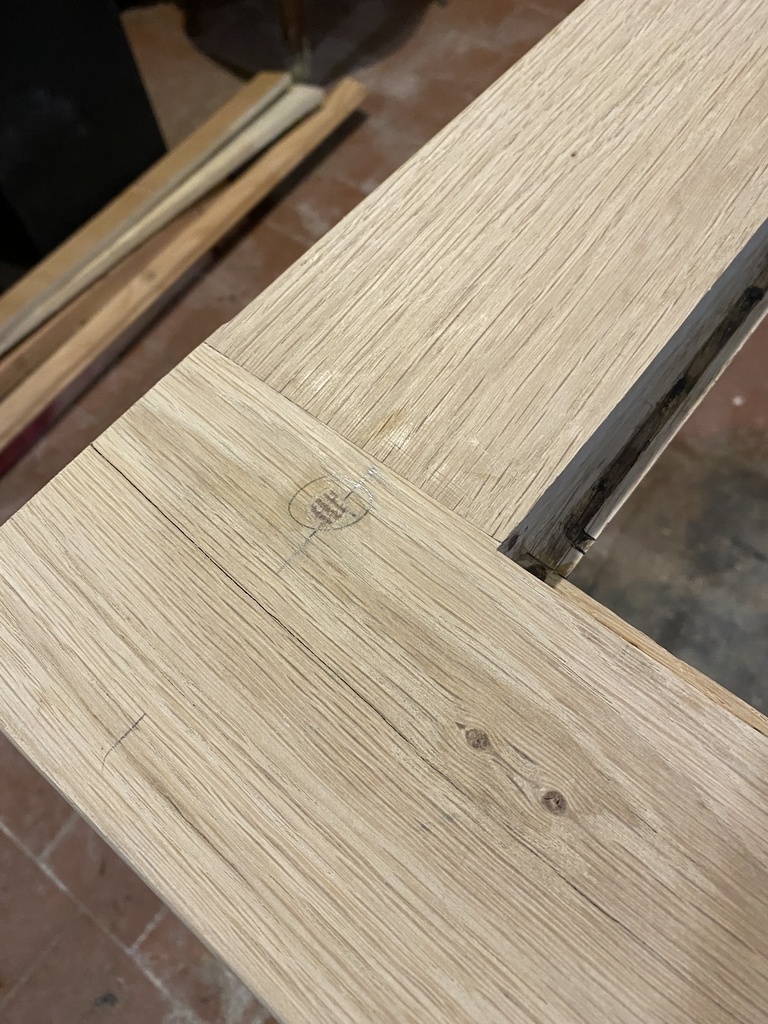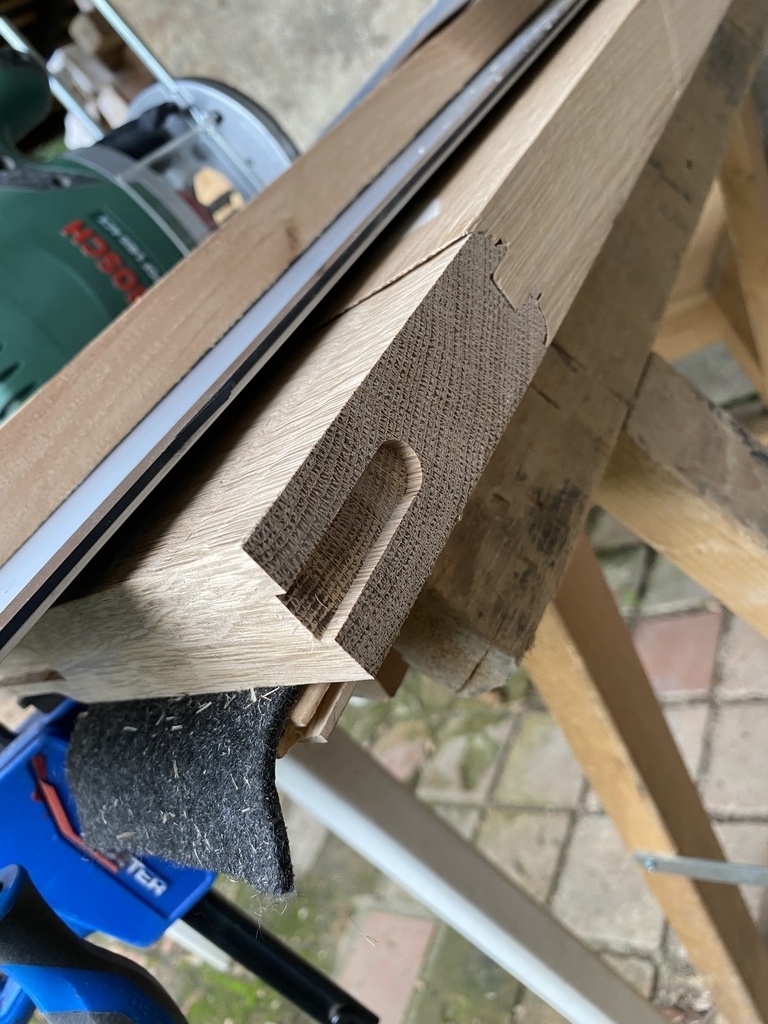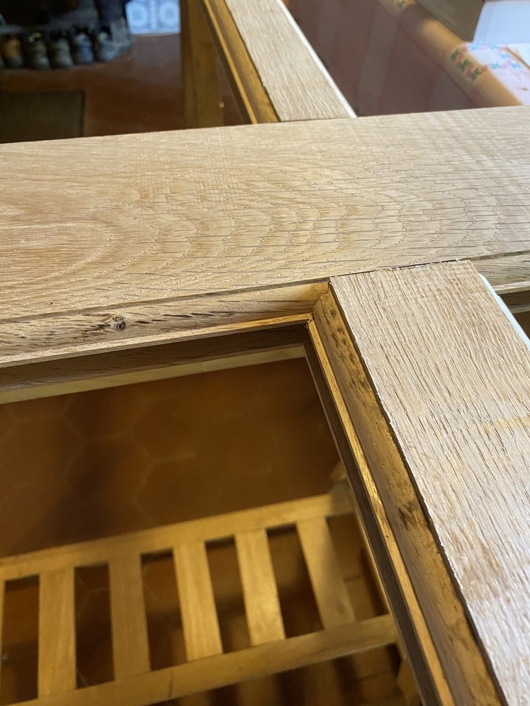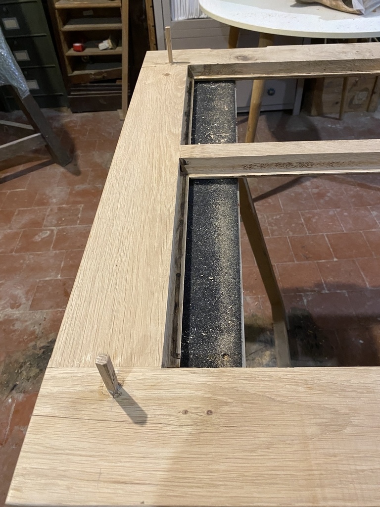 Côté intérieur, j'ai ouvert le moulurage à la défonceuse pour la pose des carreaux et je mets des parcloses pointées ; pointes tête homme et marteau dans du chêne, ça craint pour les carreaux ...!