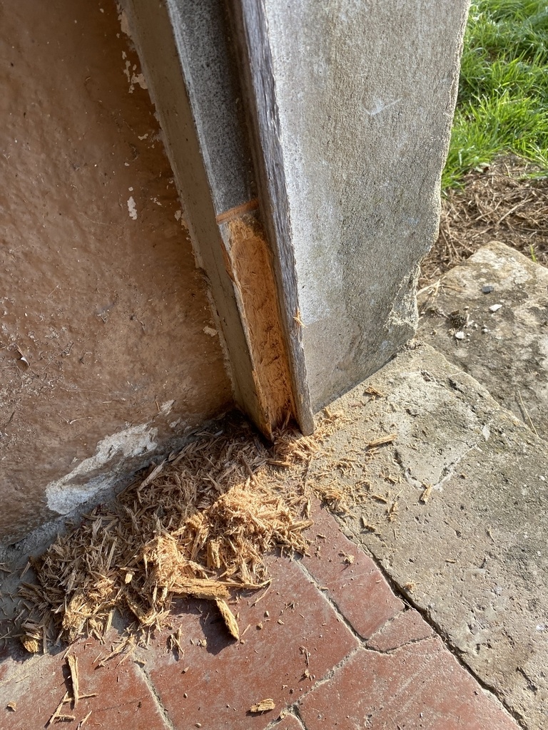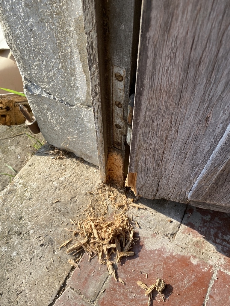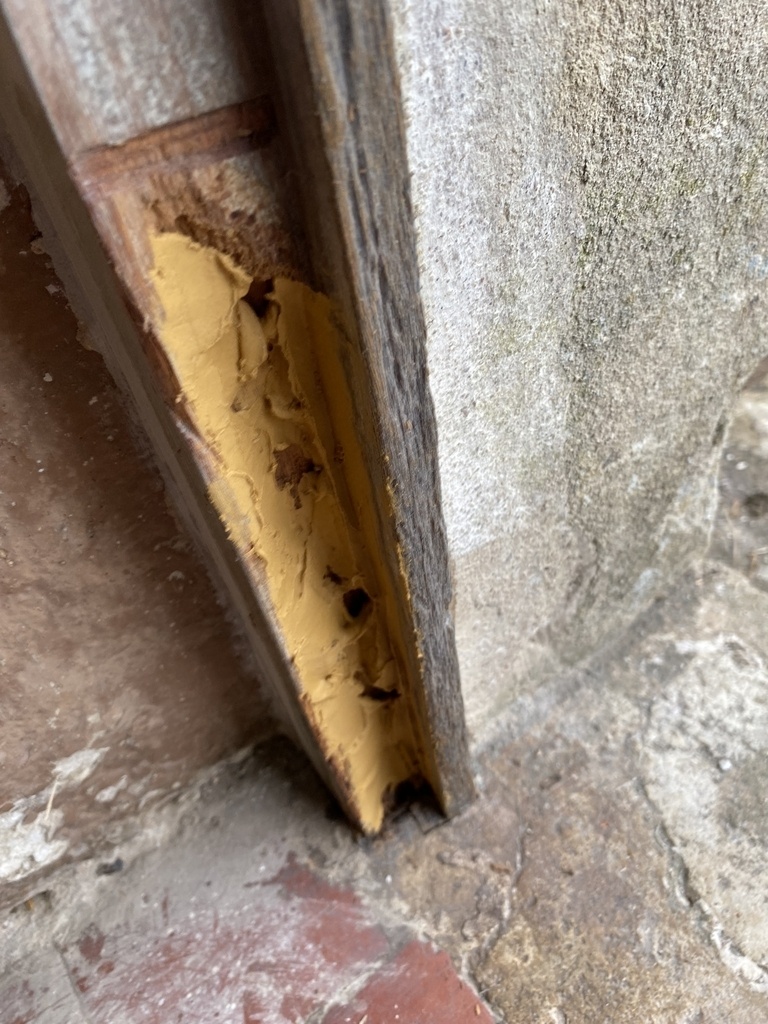 Entre deux couches de peinture j'ai le temps de passer à la réparation du bas du bâti de la porte .