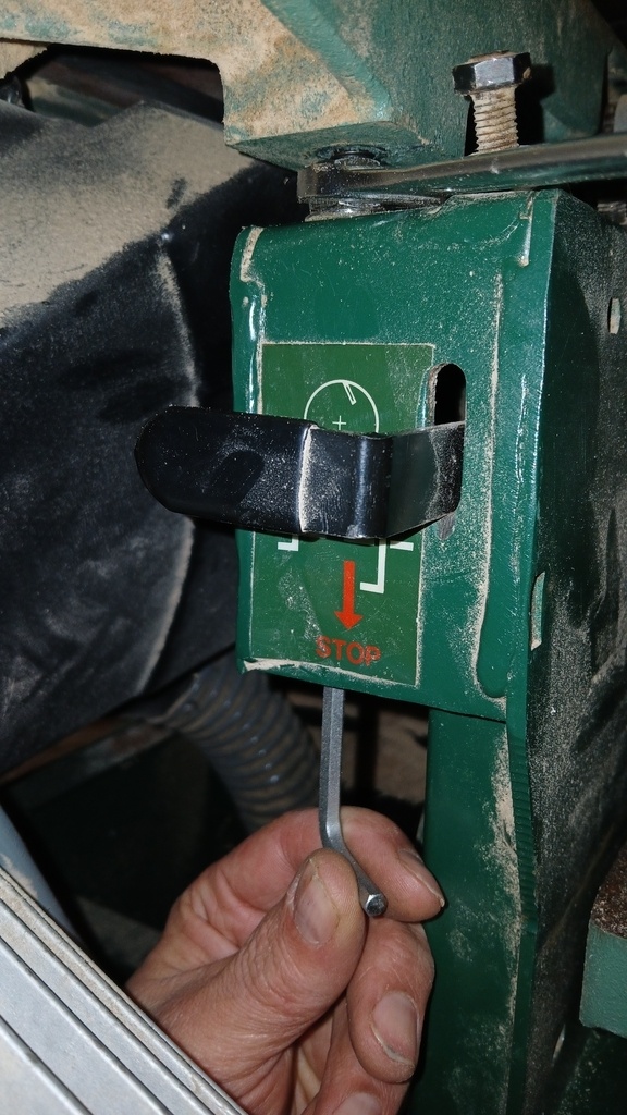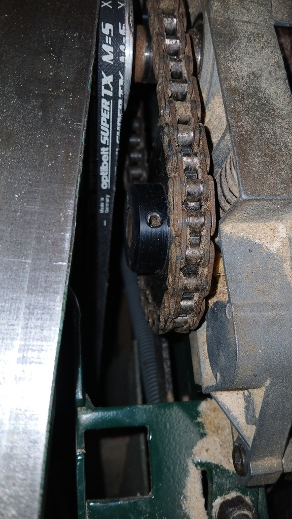 Je me suis référé à la doc disponible sur l'AdB (publication liée à ce pas à pas, merci à Remi25) pour trouver comment accéder au pignon. On y accède en décalant la table de scie. Pour ça il faut dans un premier temps déposer les trois vis situées sous la toupie. Puis desserrer la vis qui tient la table au châssis coté toupie. Ensuite déposer la vis qui maintient la table coté scie. Pour cela il faut s'aider avec un clef Allen pour dévisser suffisamment la vis afin qu'elle sorte de la table.