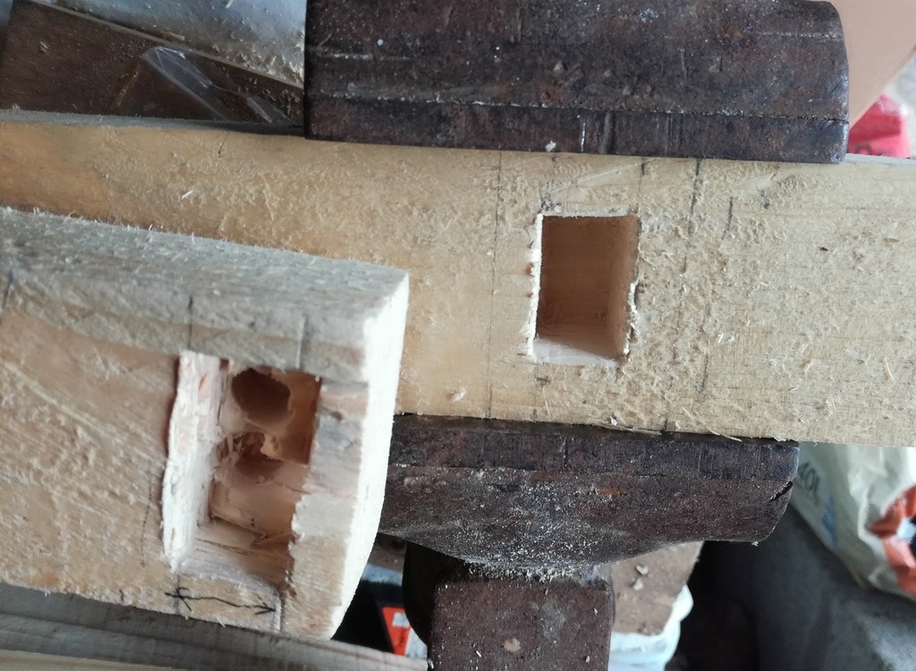 à gauche, la première mortaise de ma vie : échec, pièce perdue. Pas grave, c'est juste un peu de bois.