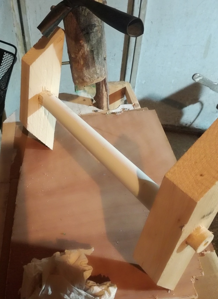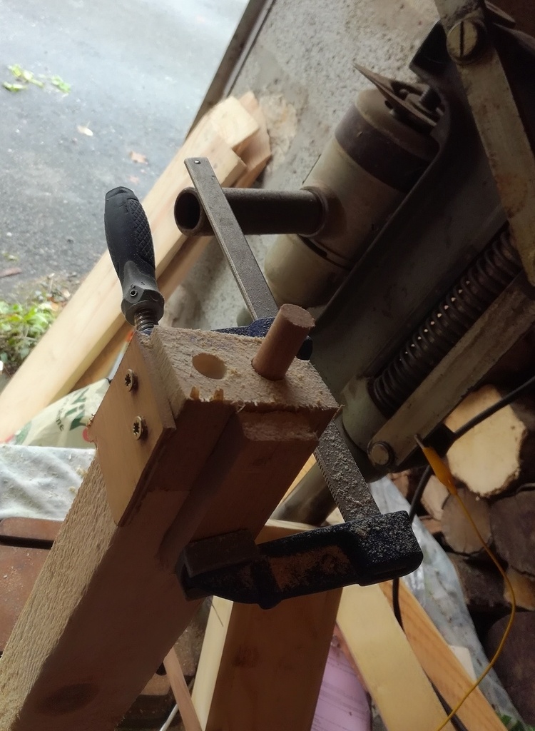 La poignée est un bout de vieille tringle à rideau retrouvée par le chat au fond du garage. La diamètre de la tringle était légèrement supérieur à celui du trou préparé, ça a été massacre à la scie-cloche sur la tringle pour qu'elle rentre...complété par des coups de ciseaux à bois. C'est pas cylindrique, mais ça a l'air de bien tenir.