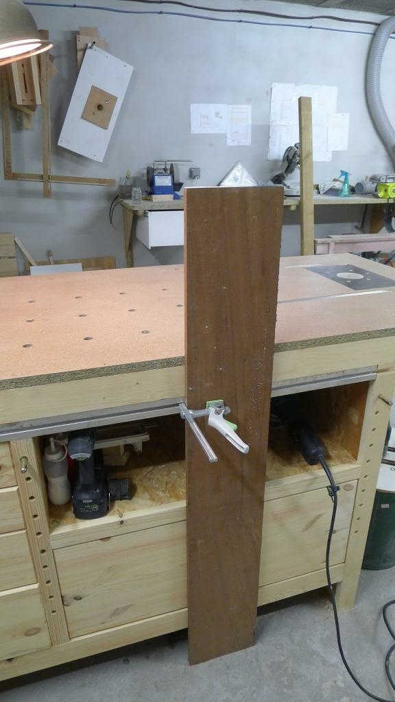 Enfin le nouveau plateau est plus grand , j’utilise le porte à faux pour fixer ma défonceuse sous table et mon gabarit à tenon et mortaise.