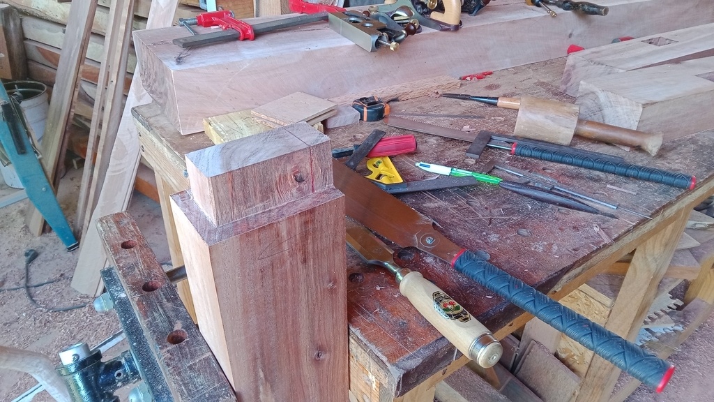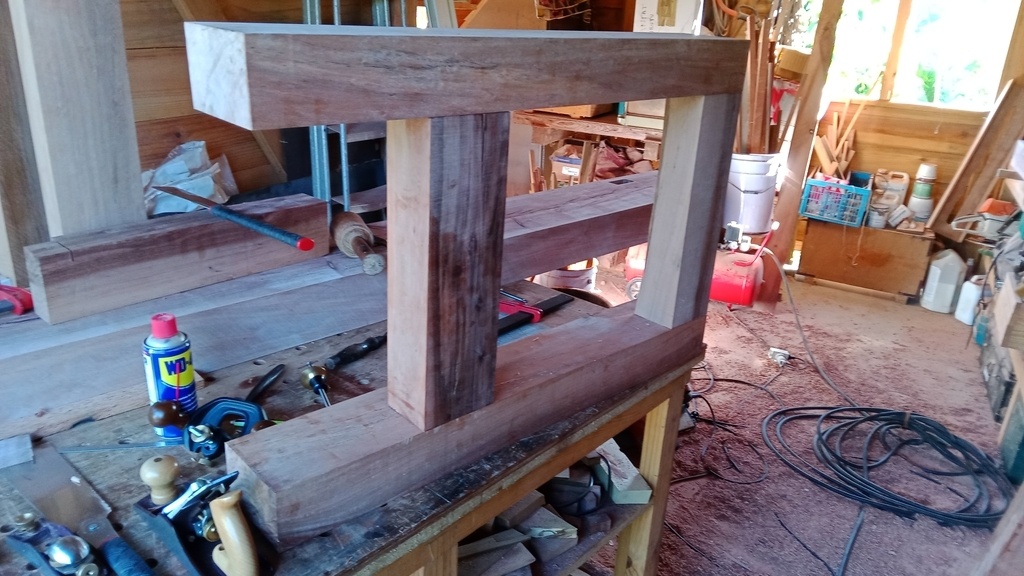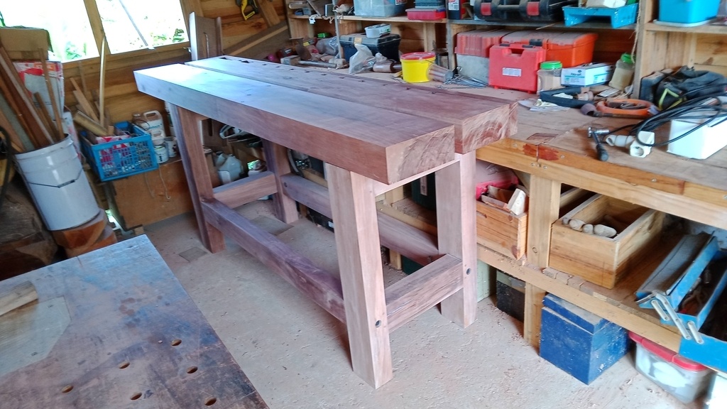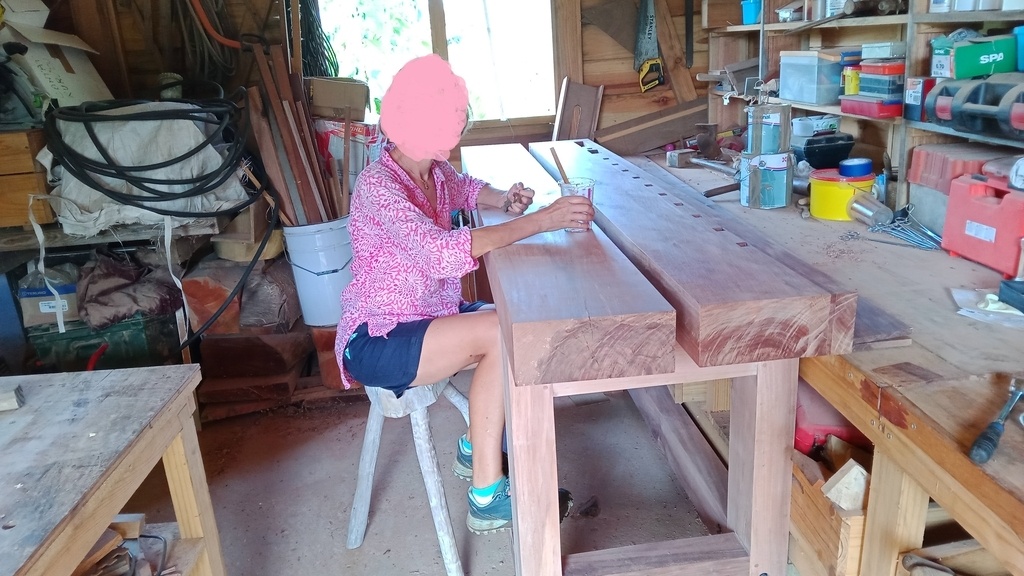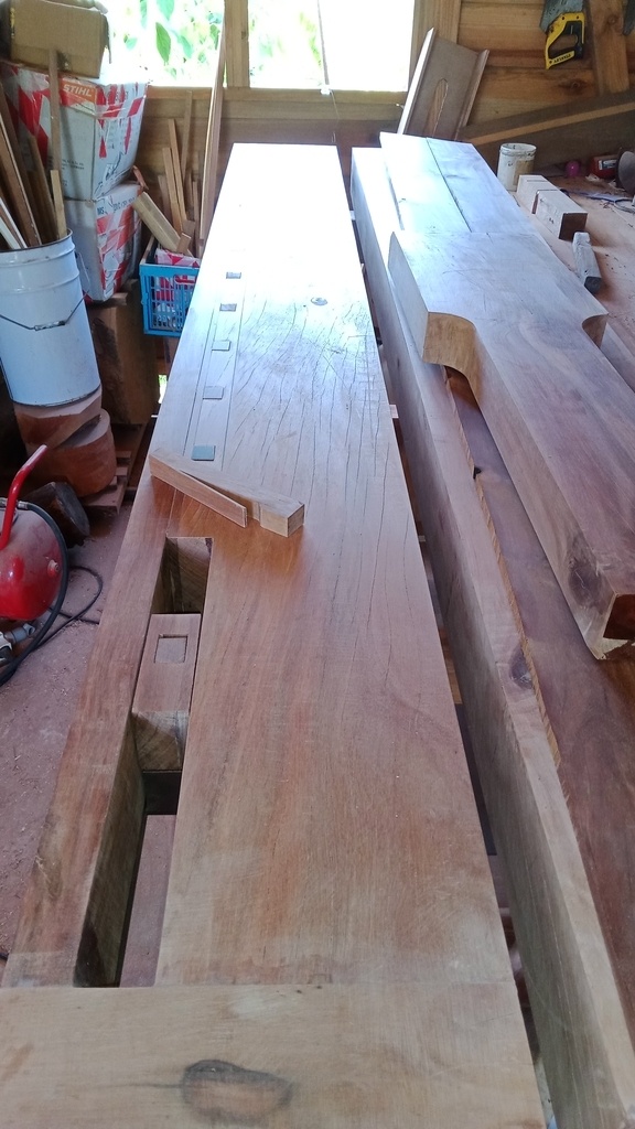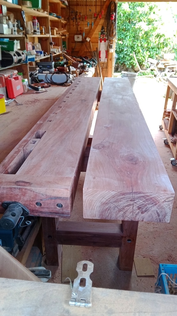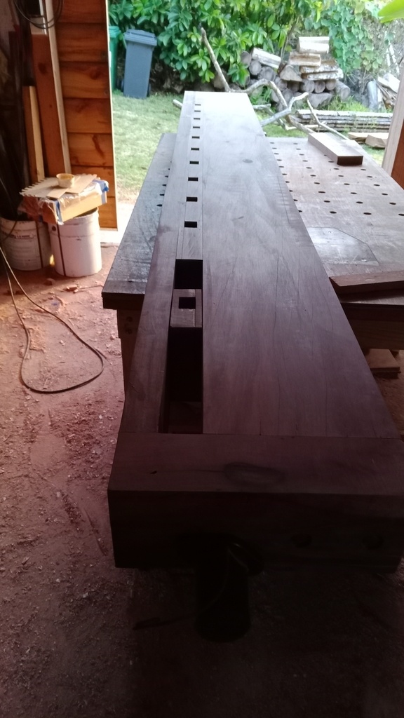 Cet établi a été commencé il y a un an et demi de cela sur l'île de Rurutu, Archipel des îles Australes, Polynésie française alors que j'y résidais encore. Je suis parti, comme à mon habitude de bois brut, à savoir un tronc de bois de fer, alias filao, alias Aïto, de son nom latin Casuarina equisetifolia.