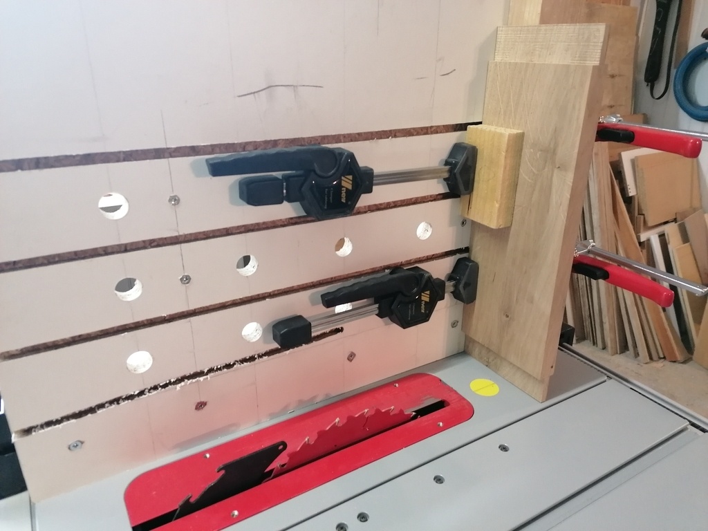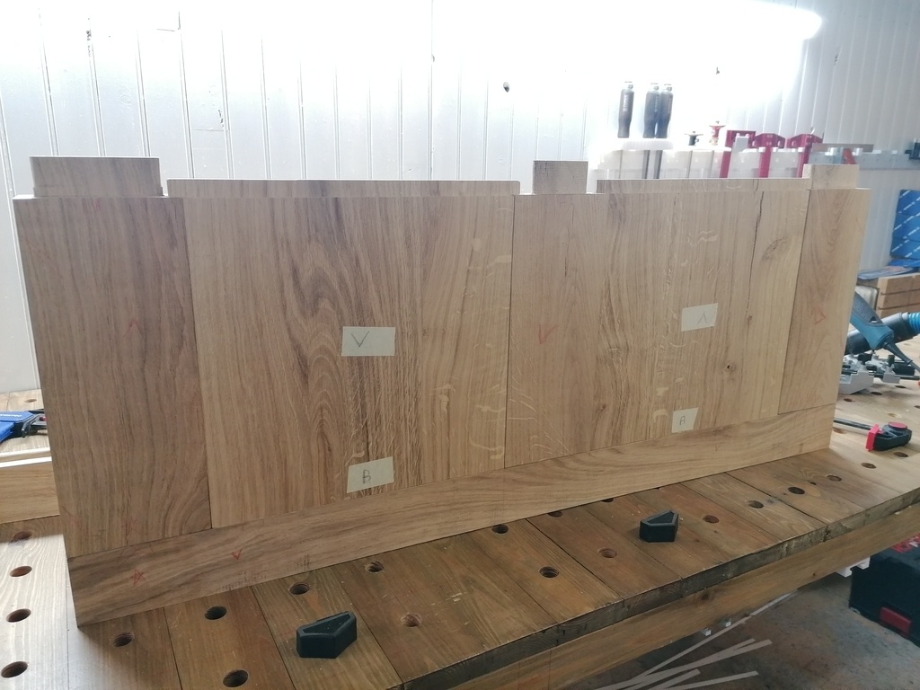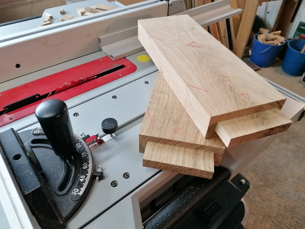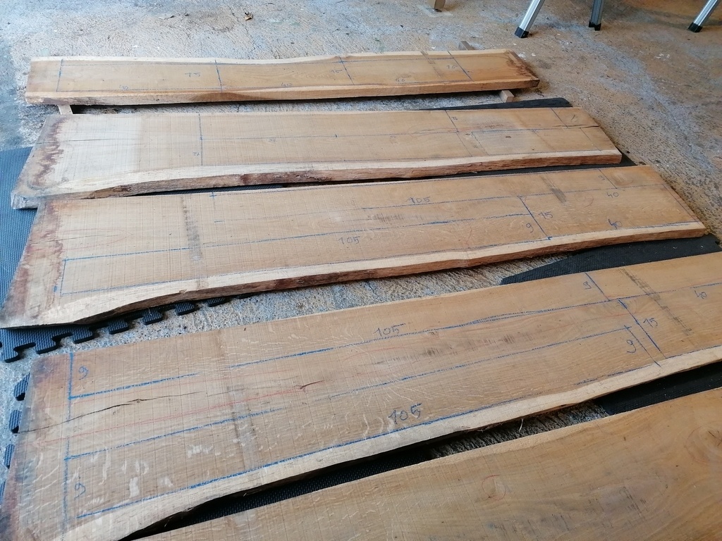 Comme expliqué juste avant, j'ai donc dégauchi et raboté mes pièces de sorte à obtenir une épaisseur de 21mm,pour qu'une fois doublées, ces dernières arrivent à 42mm.
