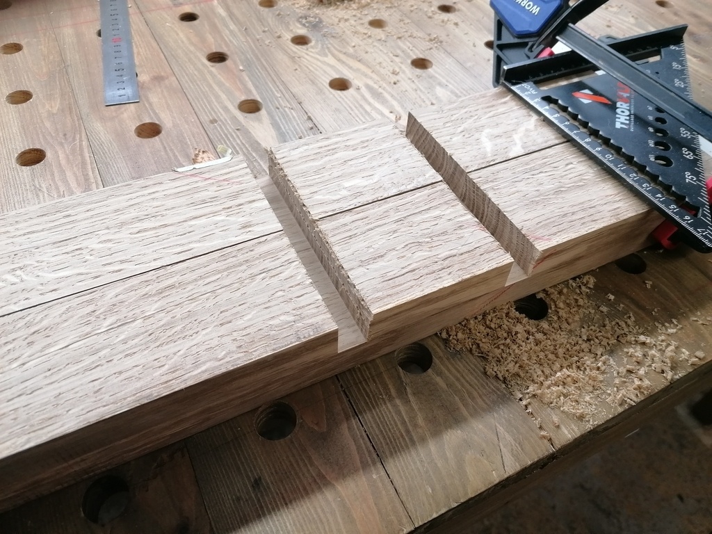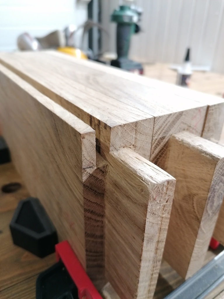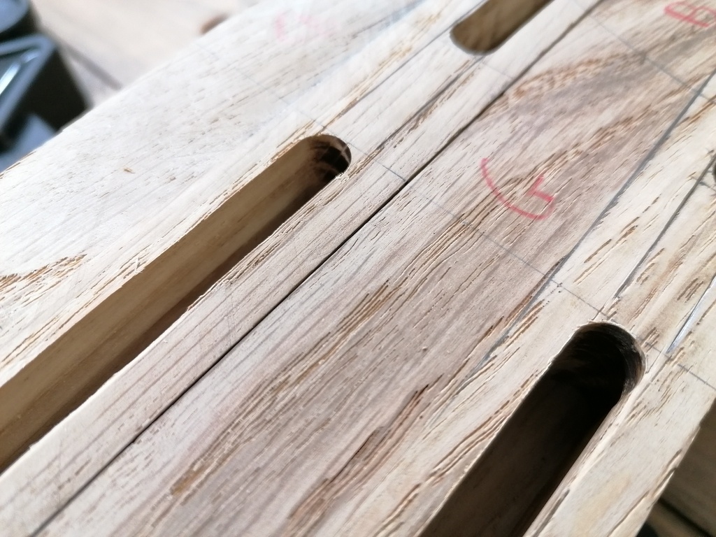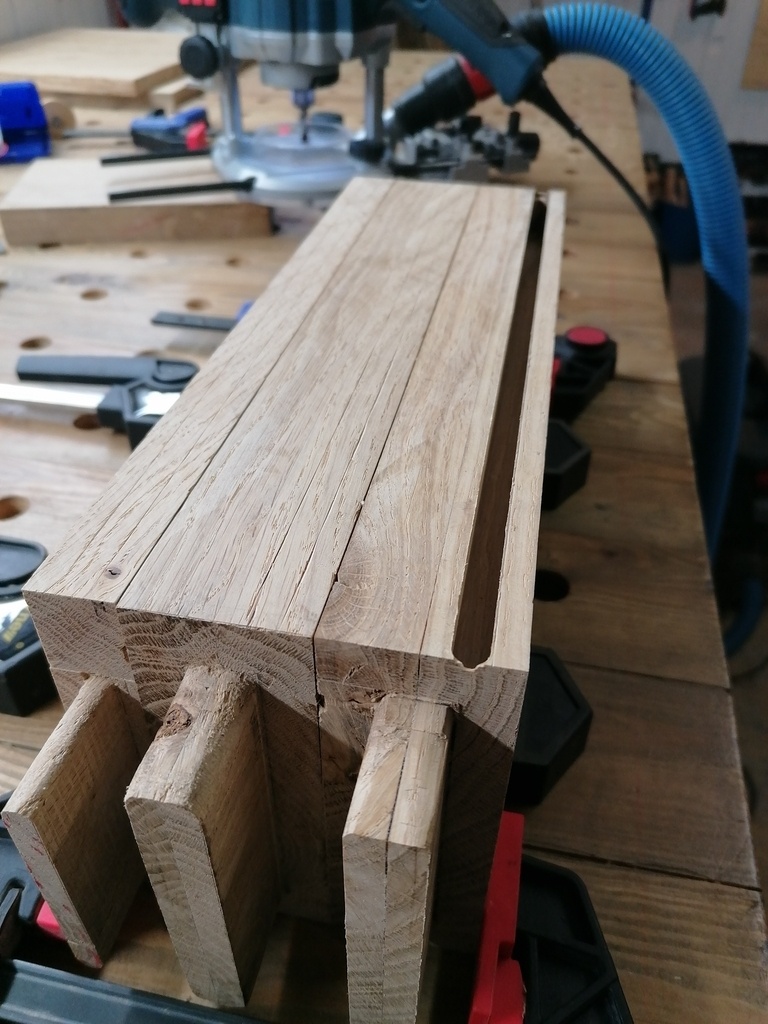 Puis, rainures débouchantes sur les traverses courtes. J'ai laissé de la matière en entrée et sortie lors des passages a la défonceuse, car j'avais peur de basculer, j'ai fini ça au ciseau a bois pour avoir un meilleur contrôle et éviter toute grosse boulette.