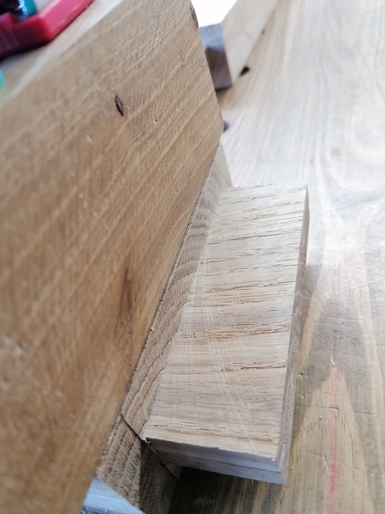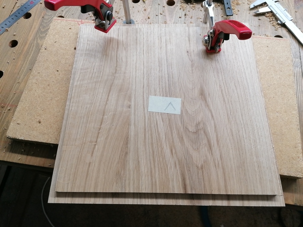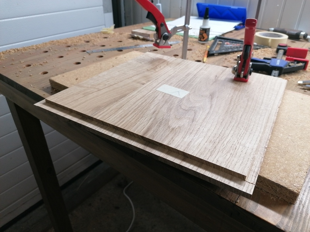 N'ayant pas de plateaux suffisamment épais pour obtenir directement l'épaisseur finale nécessaire (42mm), les différentes pièces seront donc doublées en collant à plat joint 2 morceaux rabotés à 21mm d'épaisseur.
