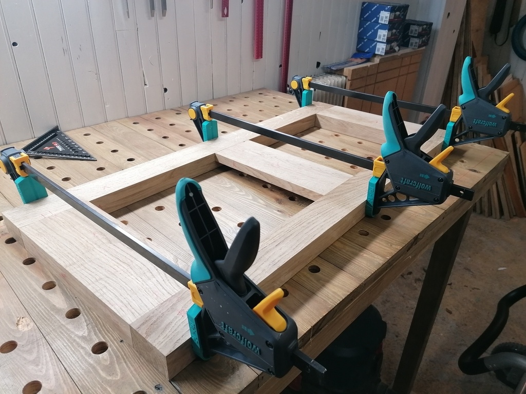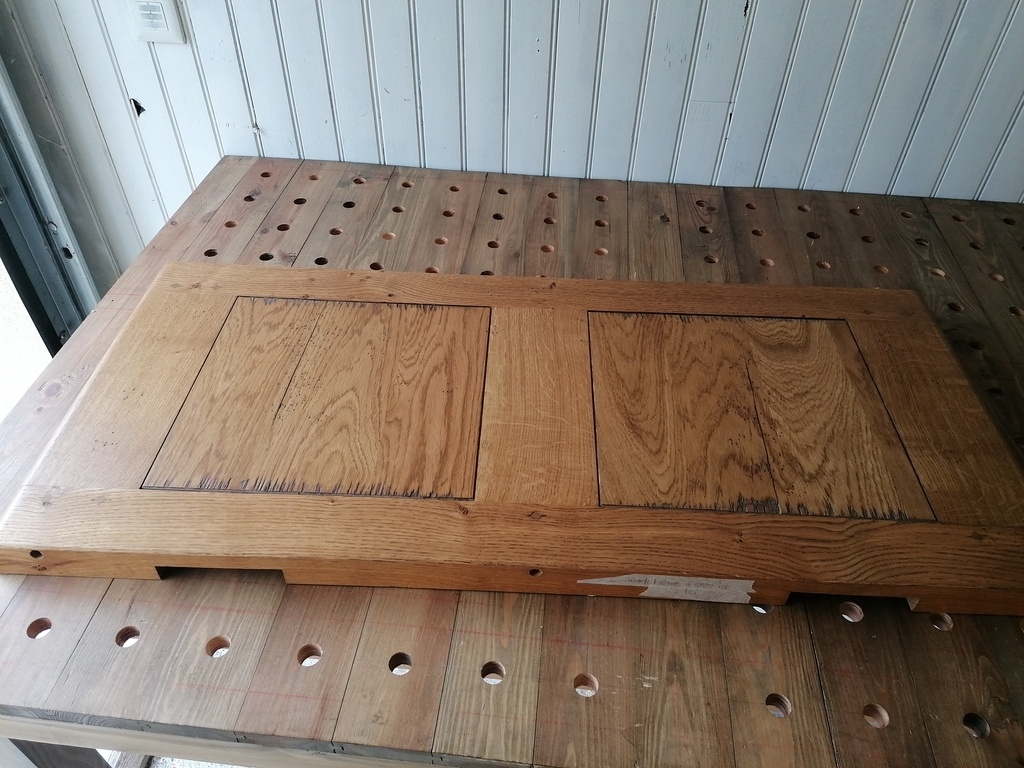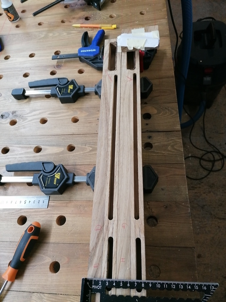 Et je me rends compte, que j'ai complètement oublié de mettre à la longueur finale mes traverses courtes, et j'ai appliqué les bonnes valeurs d'épaulement, et de longueur de tenons, sur des traverses trop longues (heureusement)...
