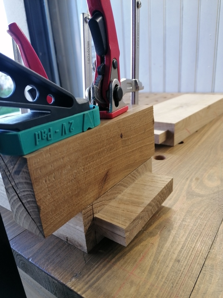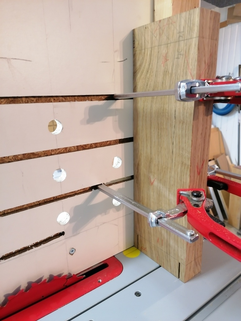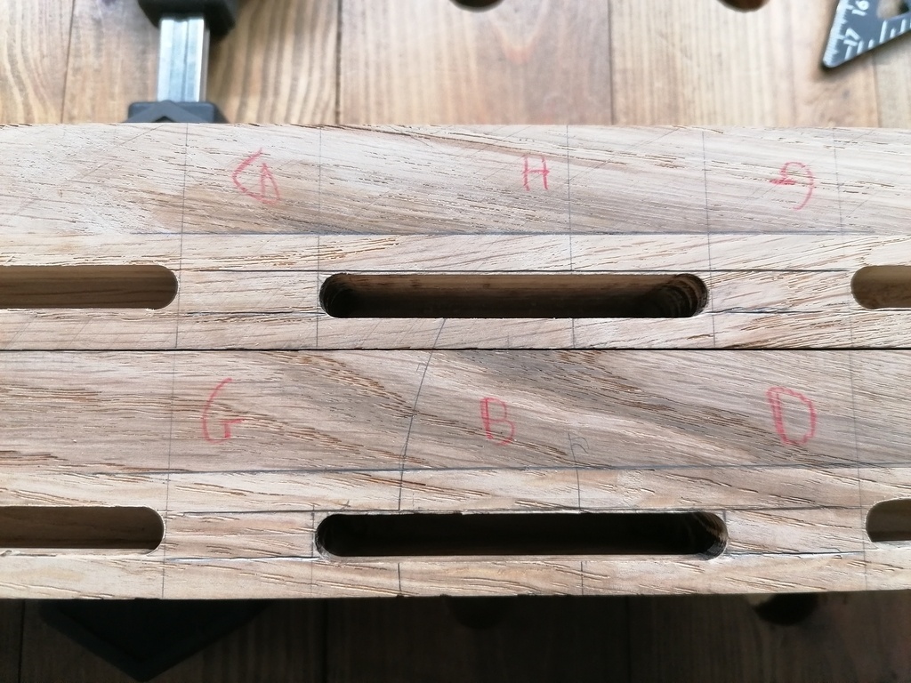 J'ai fait cela sur les 2 traverses courtes haute et basse (car elles sont toutes les deux doublées en épaisseur à 42mm,alors que la traverse courte centrale ne fait que 21mm elle)