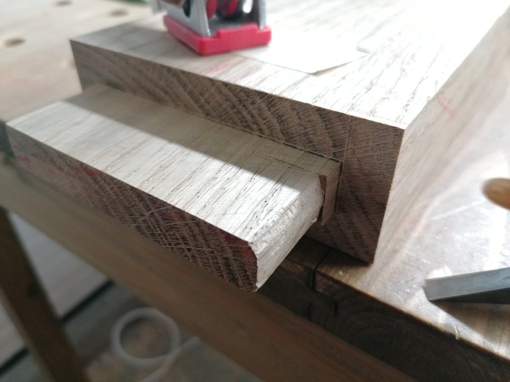 J'ai aussi eu la surprise, que la rainure débouchait tangente au tenon, chose a laquelle je n'avais pas du tout anticipé/réfléchi..