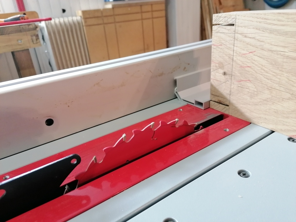 Je vérifie mes côtes d'épaulement, de longueur du tenon, je règle la scie avec le chariot à tenonner, tout se passe bien.
