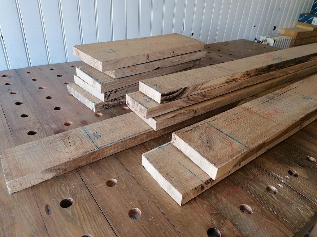 En partant d'une petite bille de chêne, j'ai donc tracés toutes mes pièces avec une sur-côte.