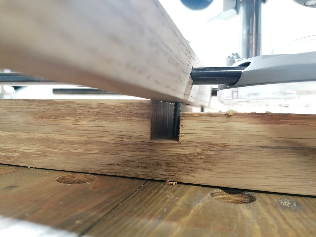 Du coup, j'ai du passer sur une fraise hélicoïdale de 8mm, et faire mes mortaises en 2 passages, via le guide parallèle, en prenant appui un coup d'un côté de la pièce et un coup de l'autre.