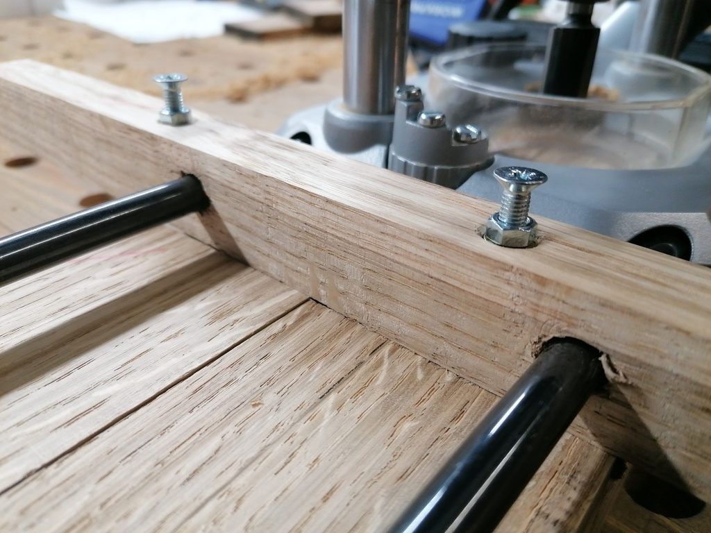 Les images vont parler d'elles mêmes, mais c'est vraiment tout bête, un morceau de bois corroyé, 2 trous du diamètre des tiges du guide parallèle, puis 2 autres trous avec 1 insert (M5 dans ce cas-ci) pour pouvoir y mettre des vis, et avoir mon réglage micrométrique. En prenant des vis bien longues, ces dernières font office de "jambe"/support.