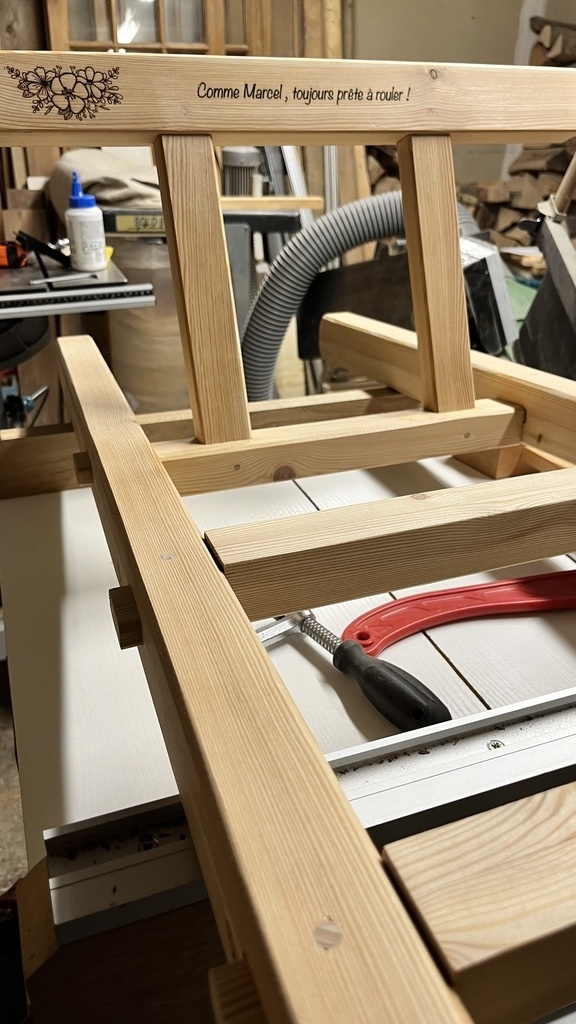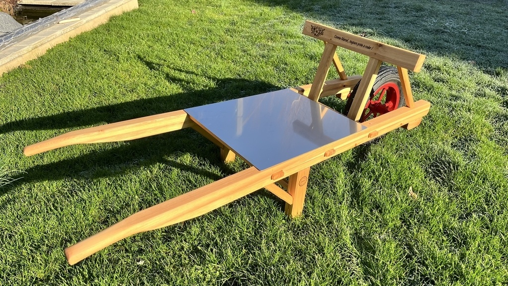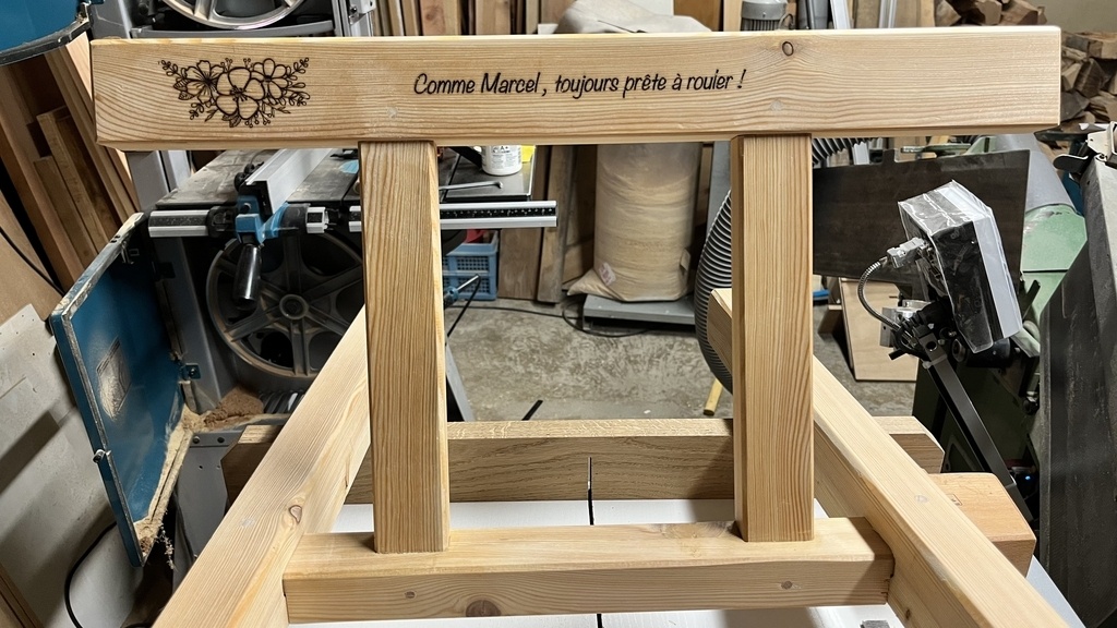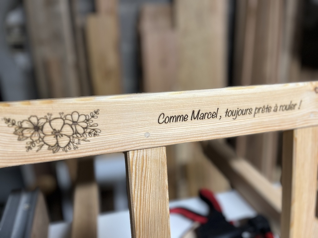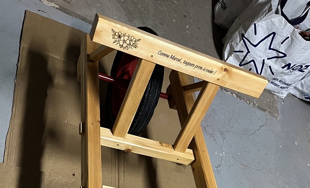 Pour personnaliser la brouette et en souvenir du Beau Père Marcel un petit message gravé au laser.