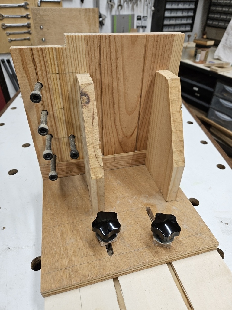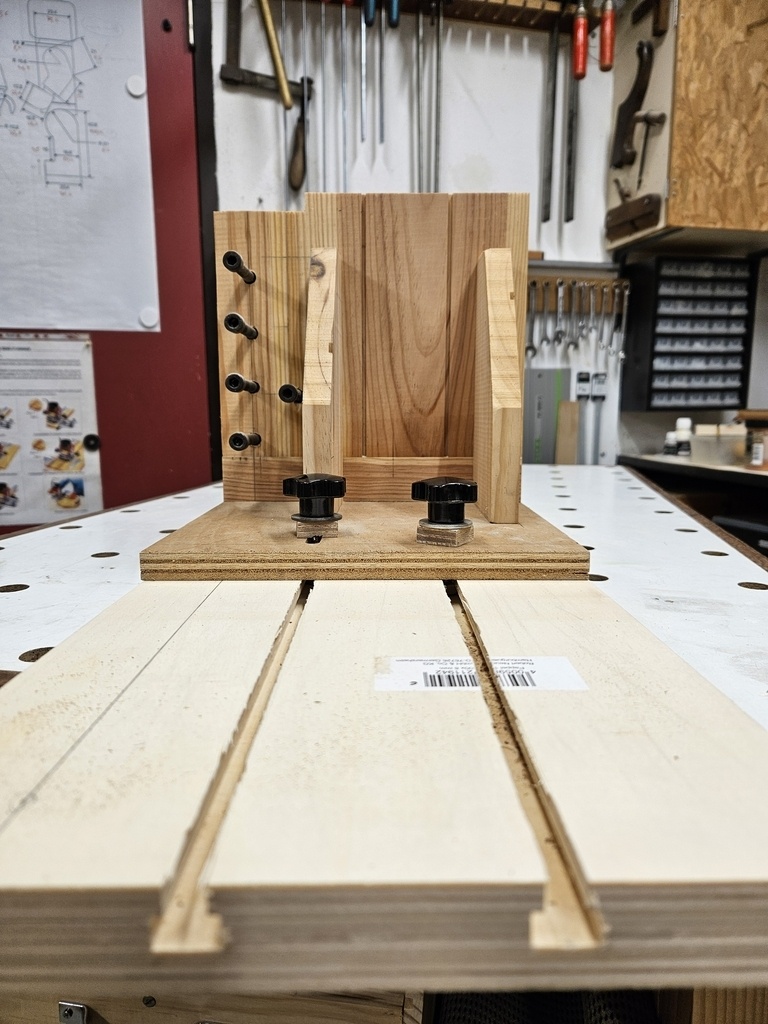 Le berceau se compose d'une plate forme avec une butée avant fixe et une butée arrière réglable. La butée arrière coulisse dans des rainures en T réalisées à la défonceuse.Le verrouillage s'effectue par vis.