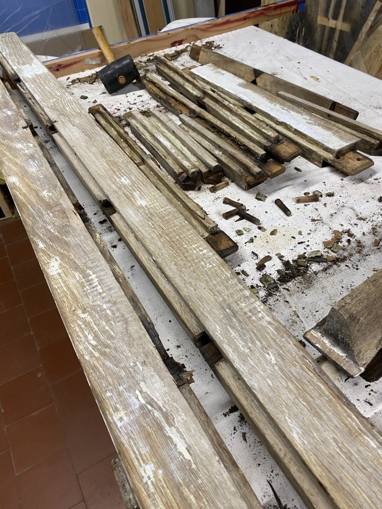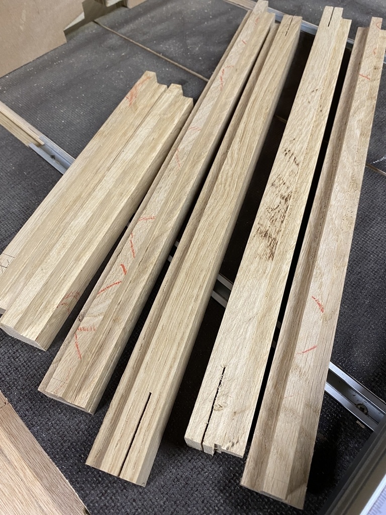 Tous les éléments sont corroyés et rainurés ; reste à faire les usinages pour les assemblages et c'est la que commence le plus gros travail pour moi .