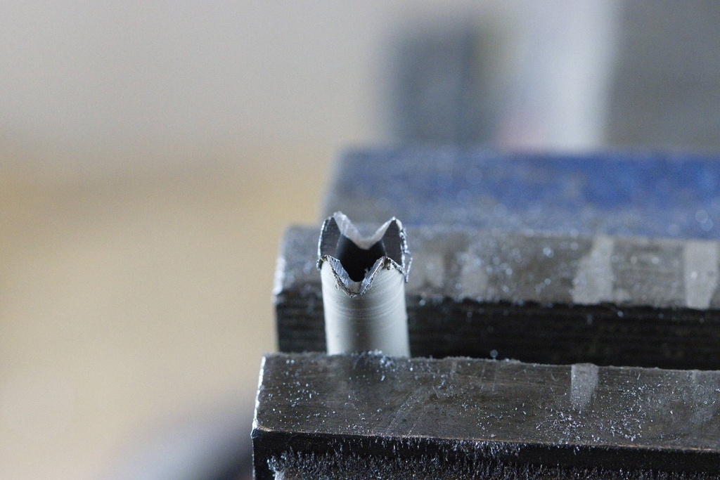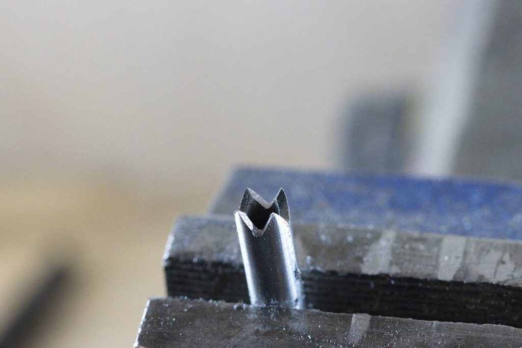 Il faut maintenant descendre en limant sans trop appuyer, on tourne le tube d'un quart pour former les quatre dents en formant les creux deux par deux progressivement, à tour de rôle.