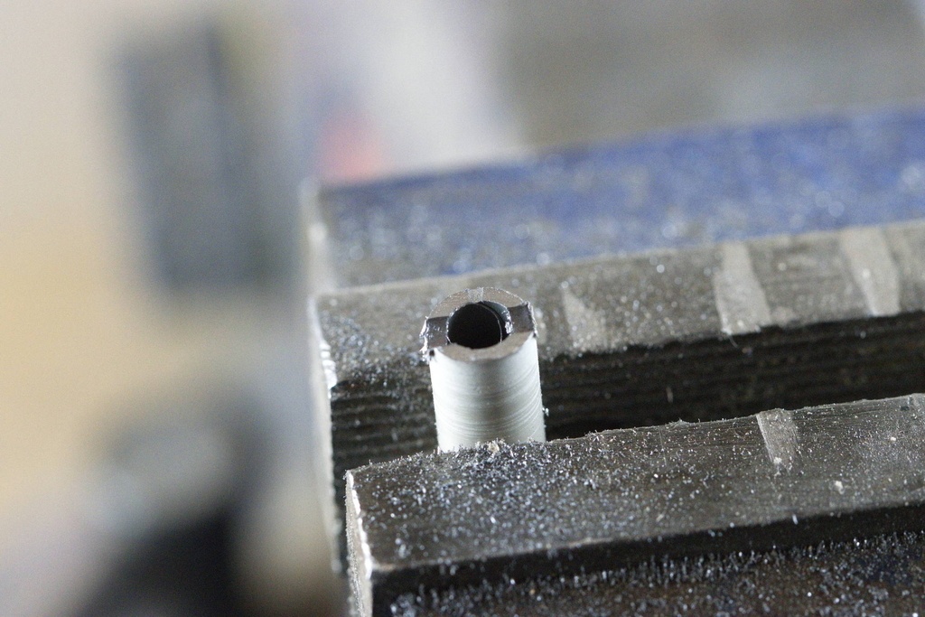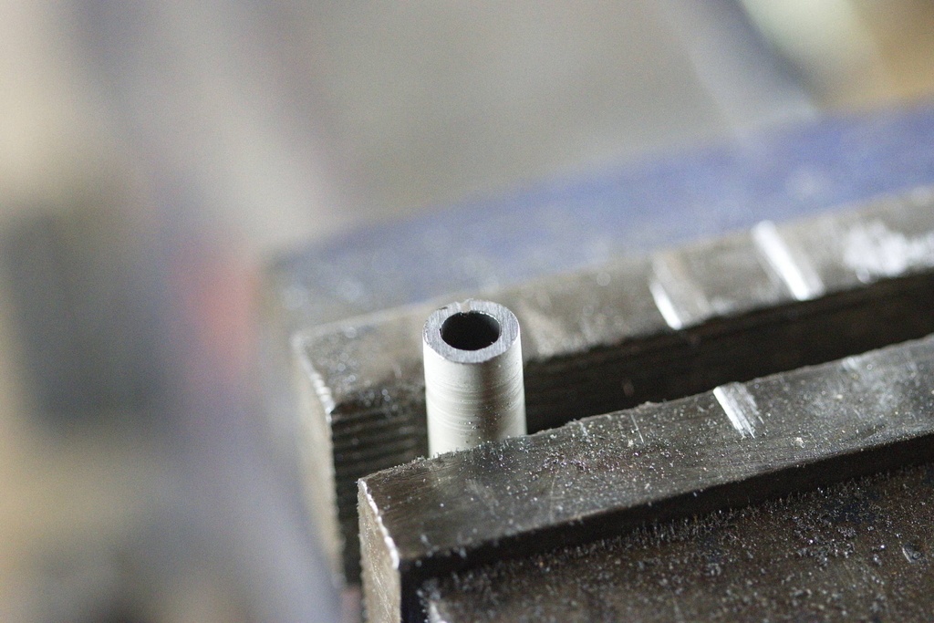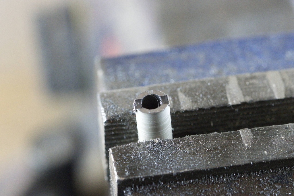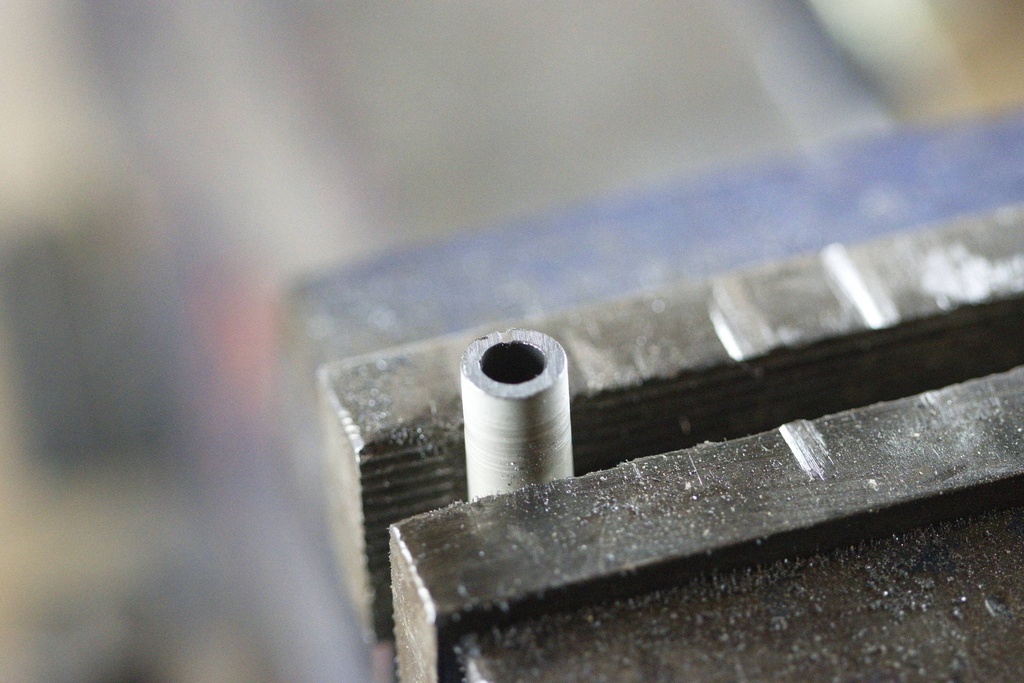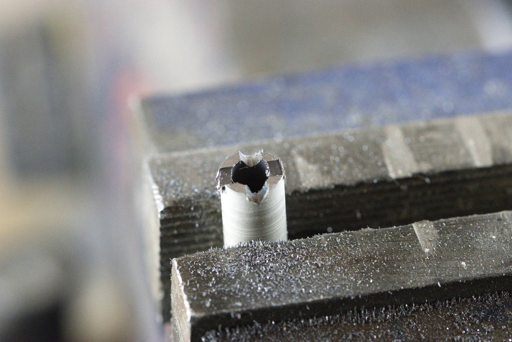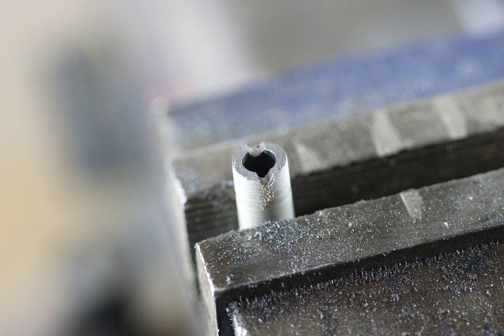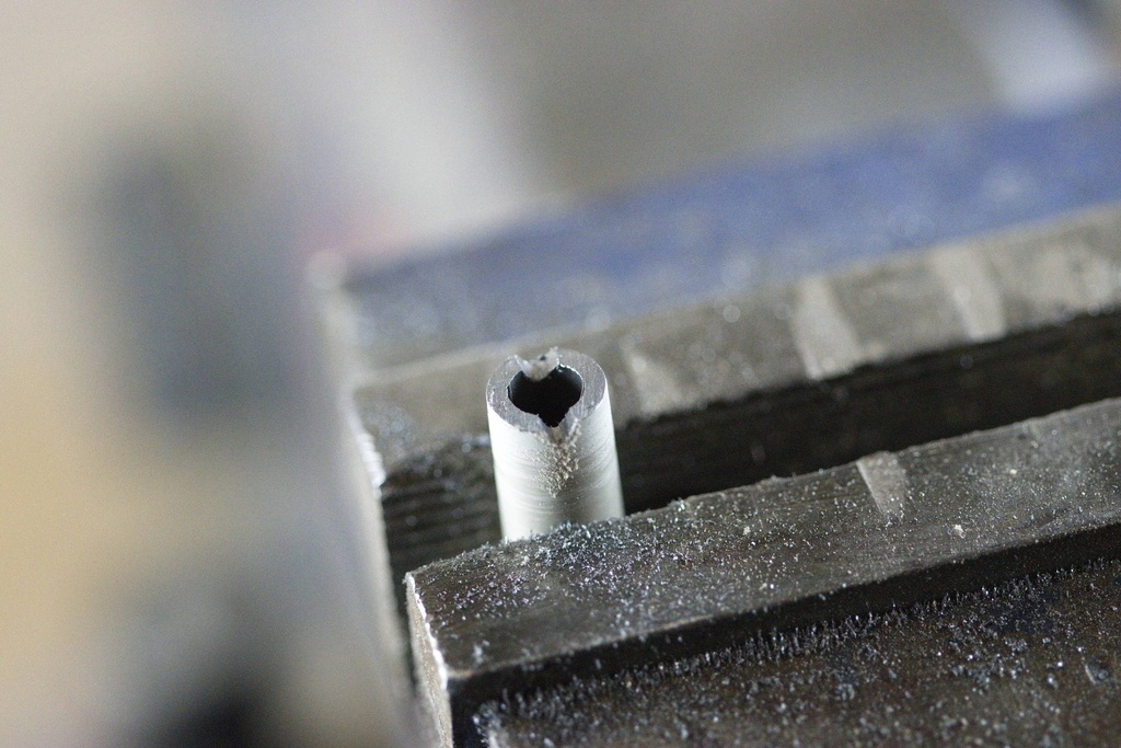 Ensuite, il reste à percer. Il faut parfois appuyer pas mal parce que les copeaux bourrent à l'intérieur du tube. Il faut parfois vider le tube à l'aide d'une tige en métal.