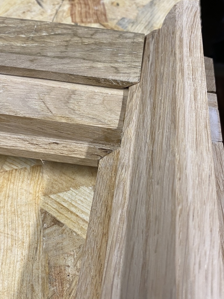 Après assemblage à froid des deux cadres de fenêtre avec les traverses de fermeture ça ne rentre pas dans le bâti ...j'ai du coup peaufiner plus tard les ravancements de moulure en grignotant quelques millimètres avec le bloc d'onglet, j'apprends à m'en servir et y prends du plaisir, le moral revient ; c'est mieux .