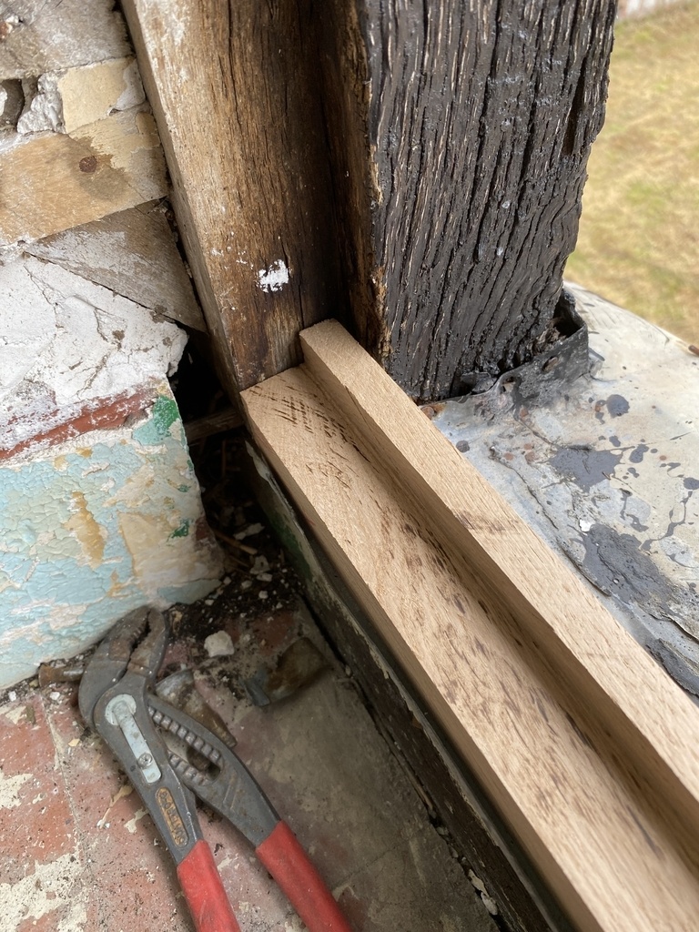 Je me doute bien que l'ouverture présente des défauts d'aplomb, aussi je démonte l'ancien cadre pour faire un essai avec la lisse du bas et vérifier les marges que j'aurai pour faire le nouveau cadre .