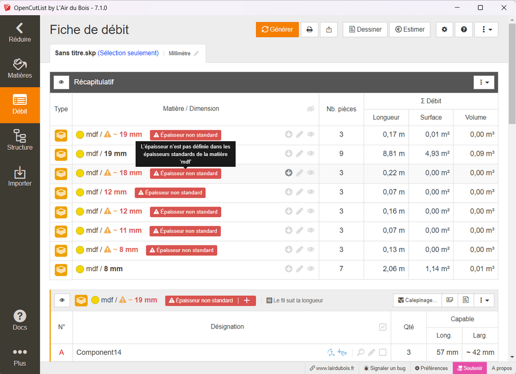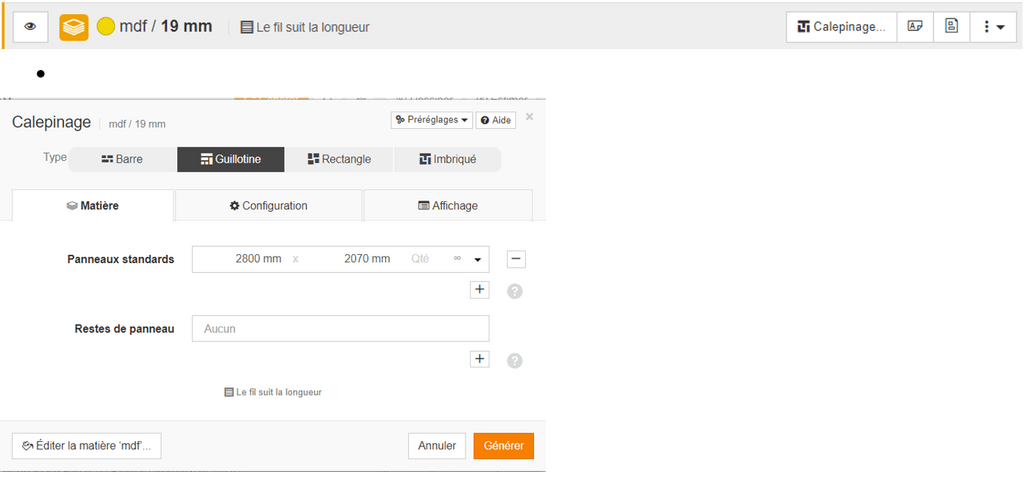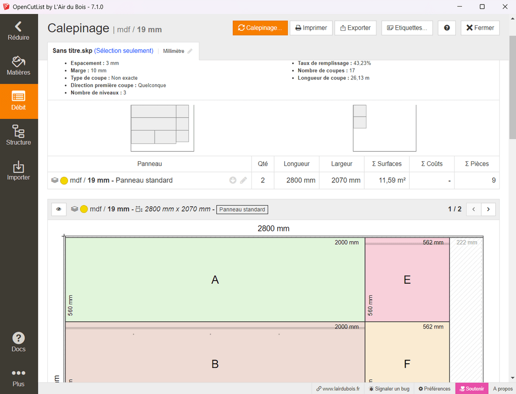 Sur la fiche de débit ci-dessus, on constate que la matière « mdf » 19mm est cohérente et peut donc faire l’objet d’un premier calcul de calepinage.