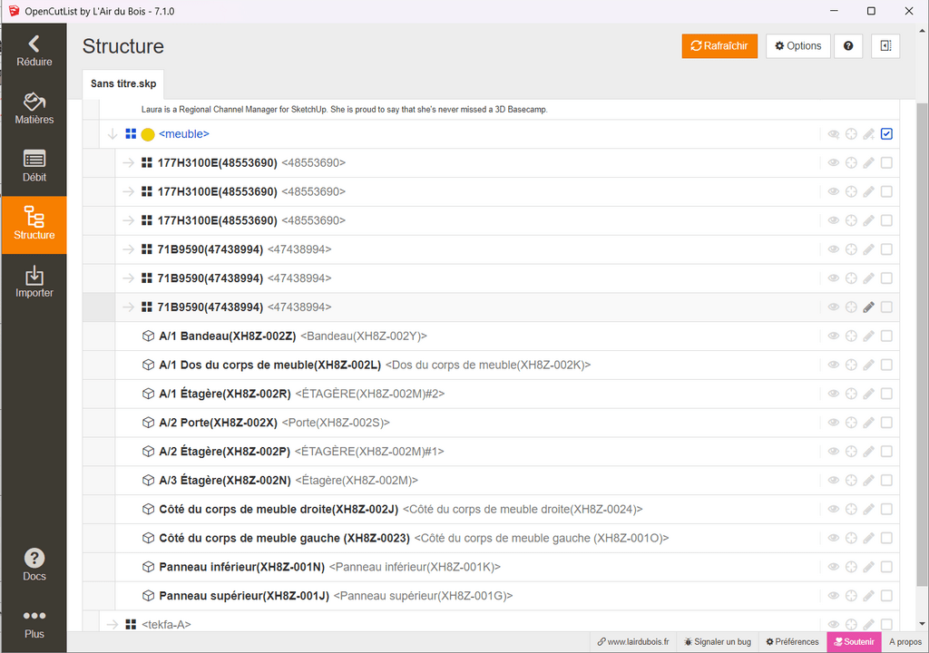 On peut constater que la matière créée « mdf » est associé à l’ensemble du meuble. Par contre, il y a du ménage à faire pour affecter correctement la matière selon l’épaisseur des panneaux.