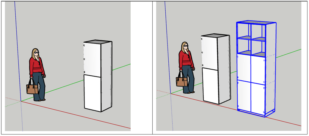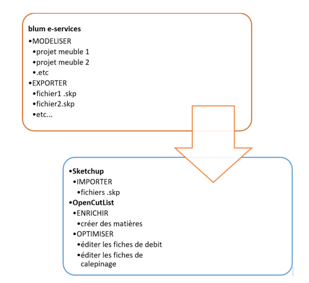 L’outil Blum permet d’exporter chaque meuble au format de Sketchup. Une fois importés, les fichiers au format sketchup (.skp) peuvent être enrichis en créant des matières qui seront utilisées par le plugin OpenCutList pour éditer les fiches de débits et de calepinage.