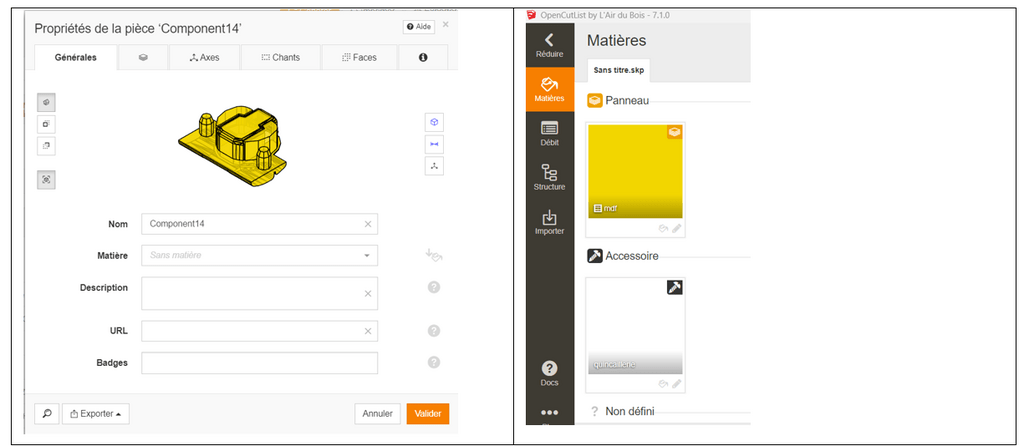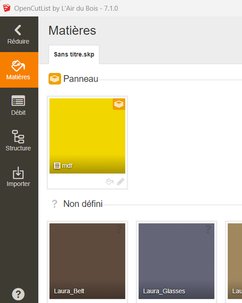 Dans OpenCutList, on crée/choisit des matières pour que le logiciel puisse générer un plan de coupe optimisé, calculer les besoins en feuilles, les chutes, et estimer les coûts
