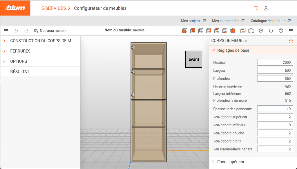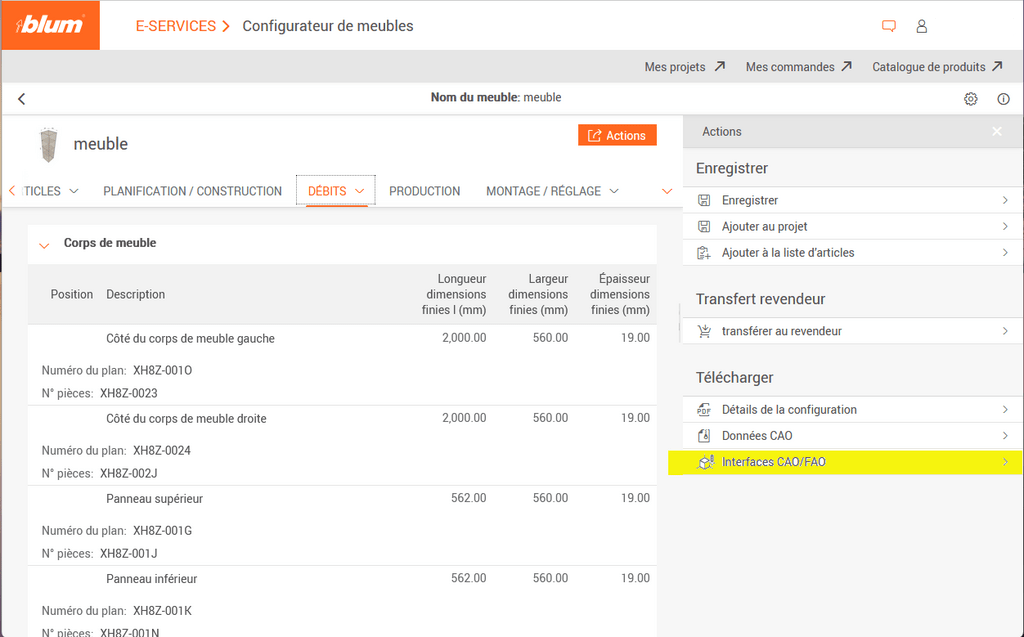 Dans l'atelier de mon ami menuisier, la conception des meubles se fait notamment avec le logiciel Blum e-services compatible avec les outils de sa chaîne de production. Sauf erreur, malheureusement, le logiciel de blum ne dispose pas encore d’un outil d’optimisation des plans de découpe des panneaux.