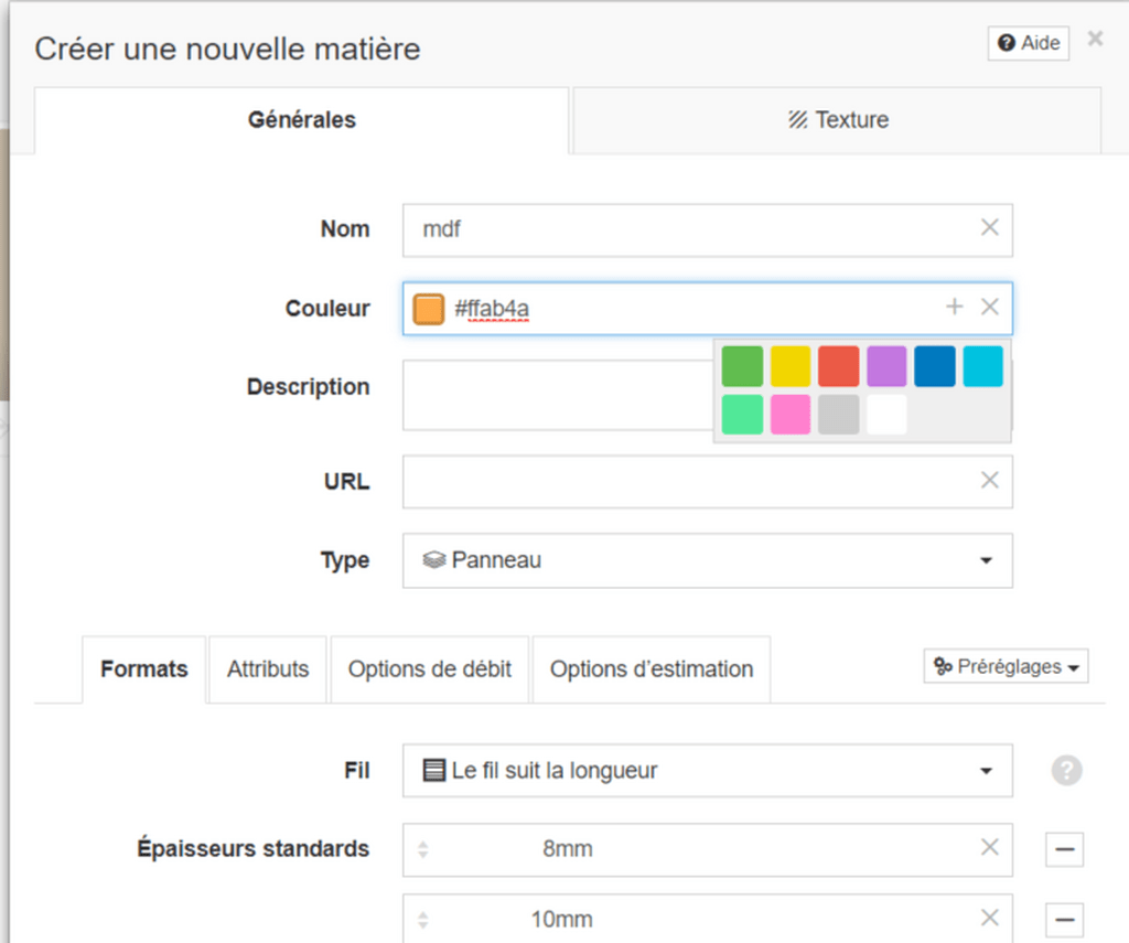 Une "matière" dans OpenCutList désigne le type de panneau ou de bois que vous utilisez pour vos coupes et assemblages — par exemple un panneau MDF 18 mm, du contreplaqué 9 mm, une planche de chêne 27 mm, ou une tôle. Elle contient les propriétés suivantes :