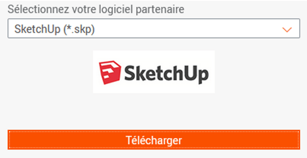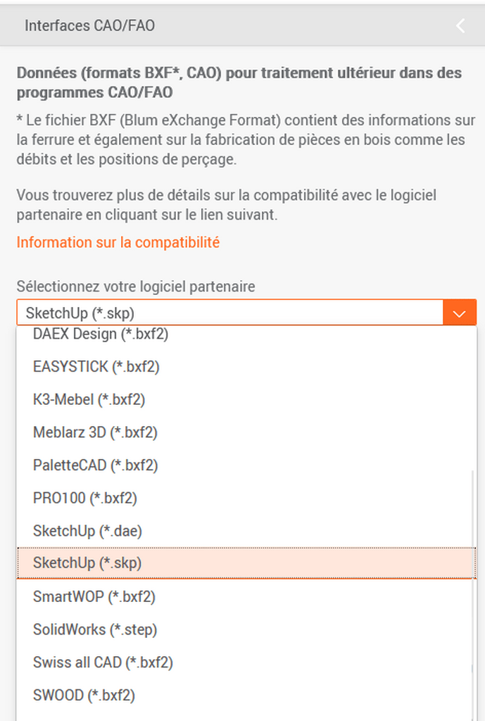 Une fois la conception du meuble terminée, il faut l’exporter au format Sketchup. Dans la page semblable à celle ci-dessous, cliquer sur Interfaces CAO/FAO