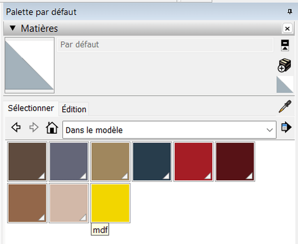 Dans la « palette par défaut », pour l’onglet « Matières », on voit maintenant apparaître notre matière mdf