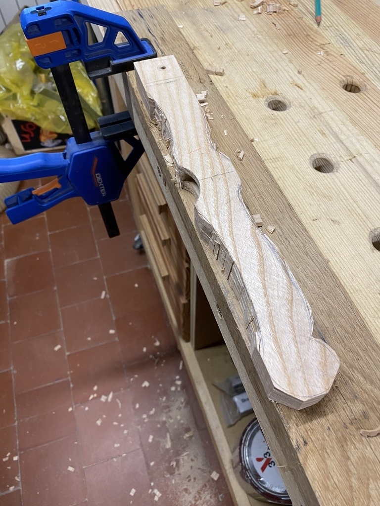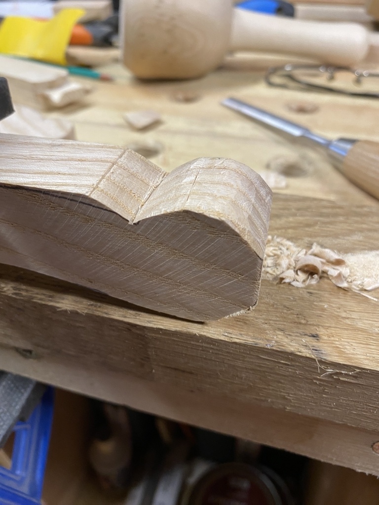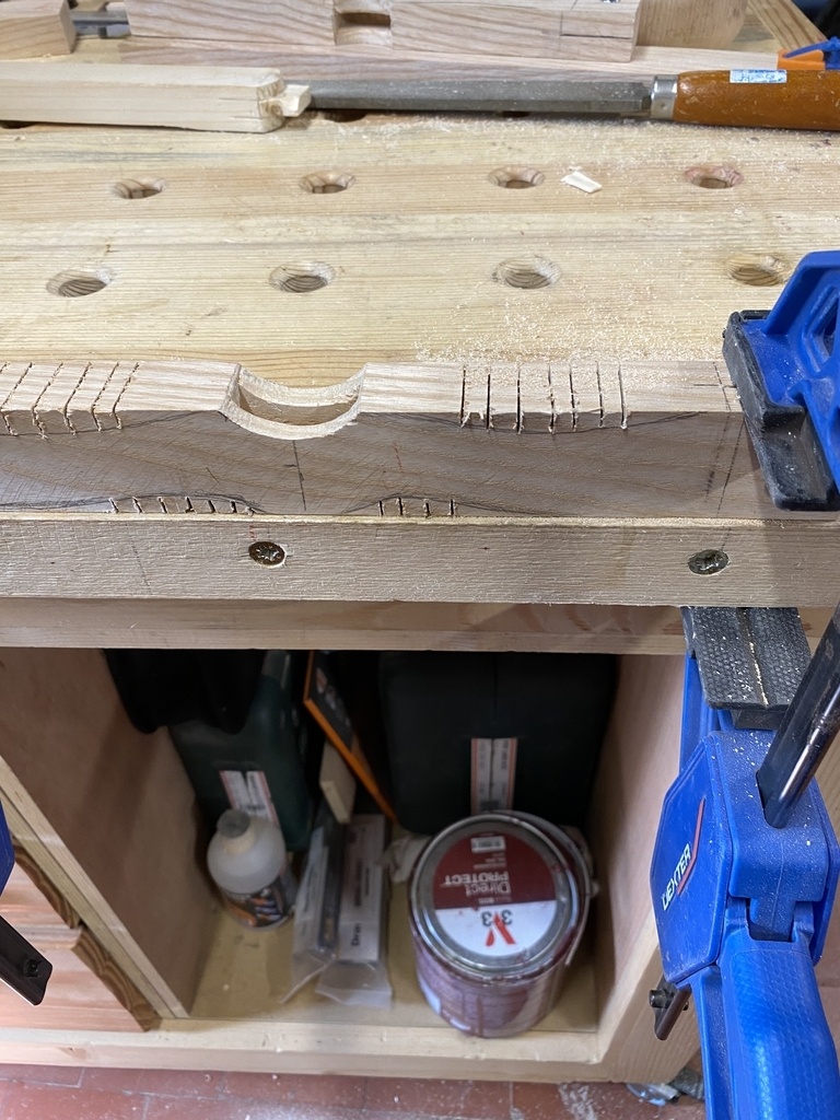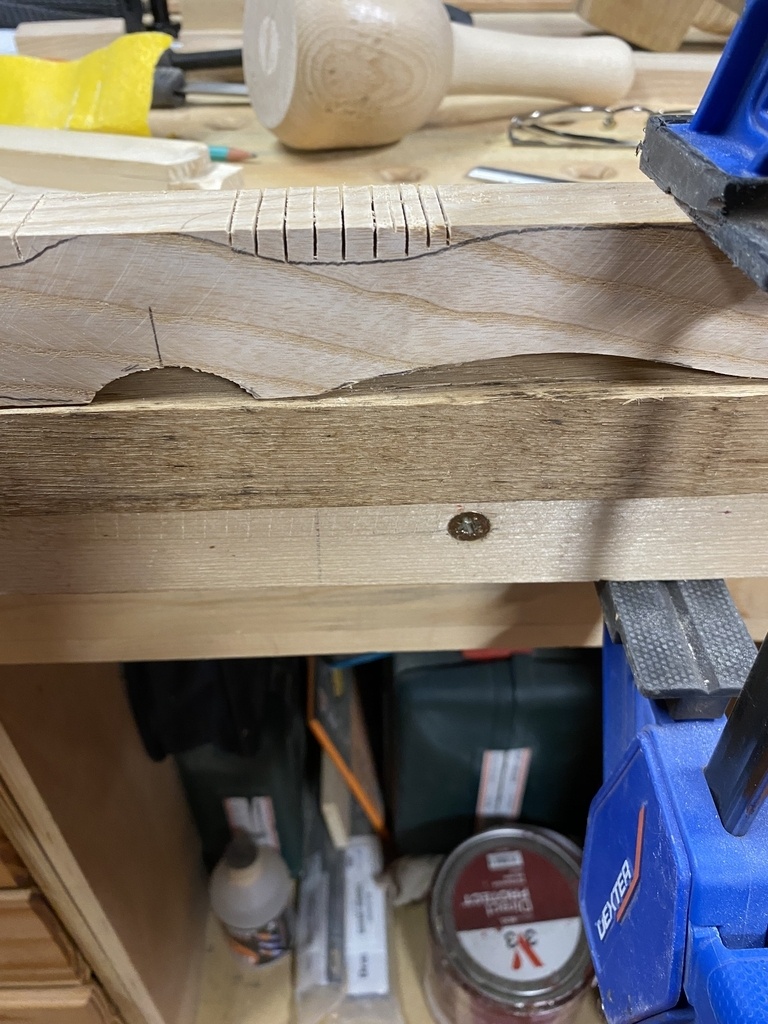 Je m'attaque aux deux mortaises avec le bédane de 8 ; je ne m'en suis pas trop servi jusqu'à maintenant, c'est l'occasion d'apprendre . Pas si simple mais avec un peu de patience j'y arrive et je continue tout de suite avec l'arrondi .