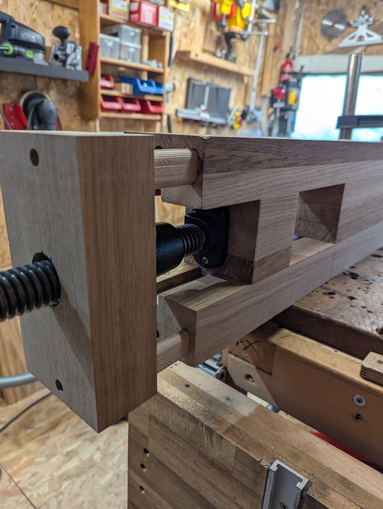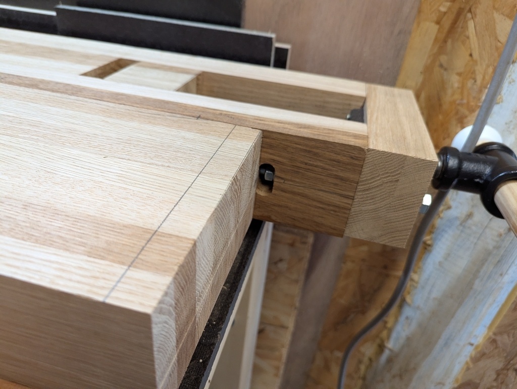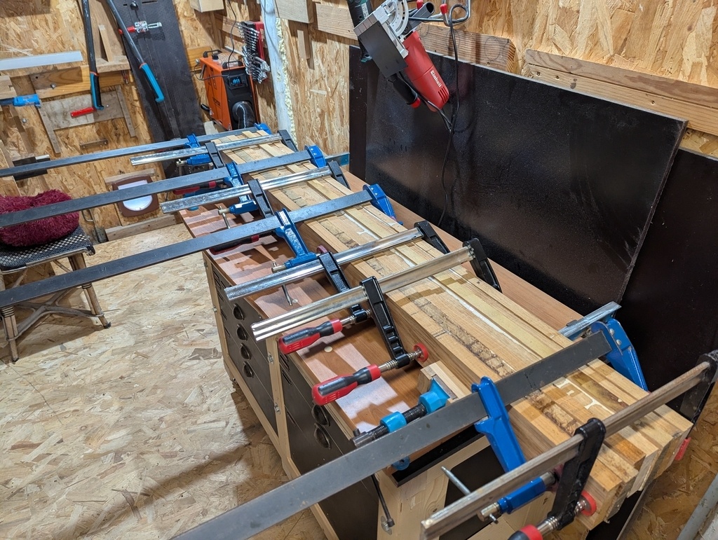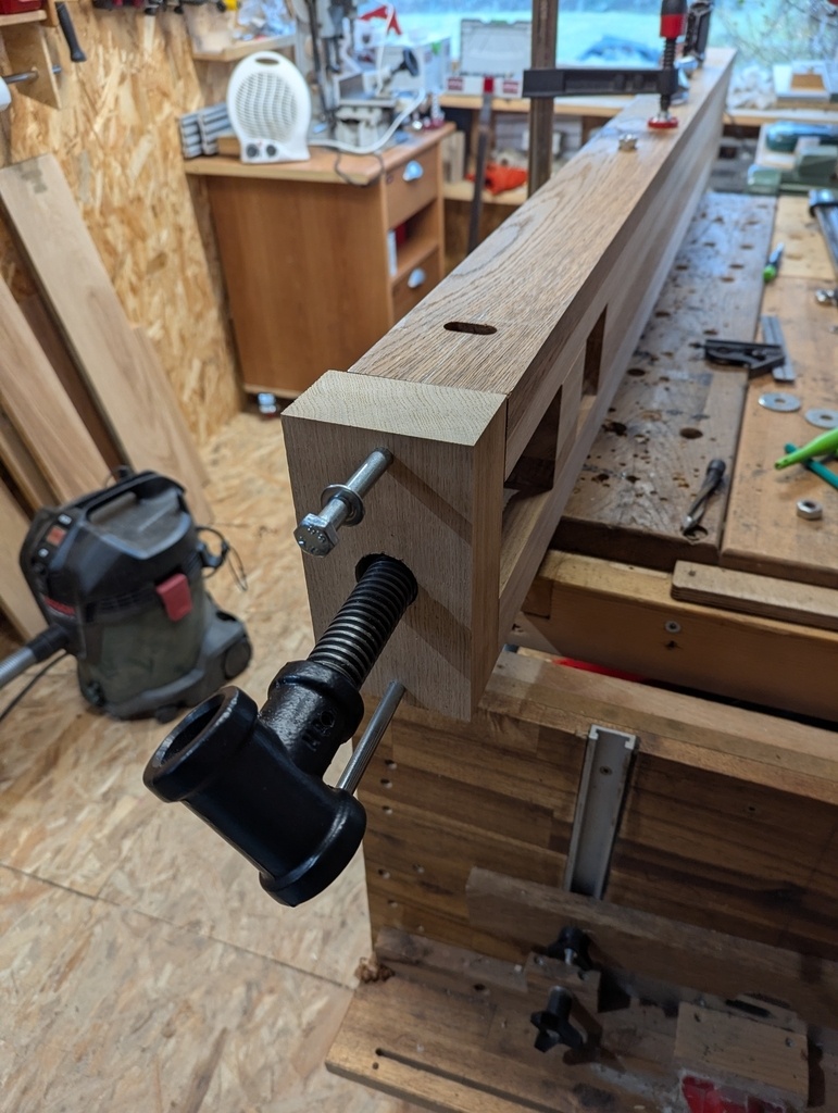 Toutes les pièces sont simplement collées, sans recours à des dominos ni à des lamelles : un bon gros lamellé-collé, assumé. De nombreux serre-joints sont mobilisés pour assurer un maintien homogène de l’ensemble.
