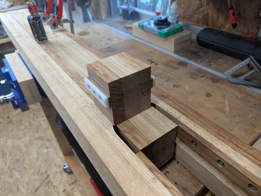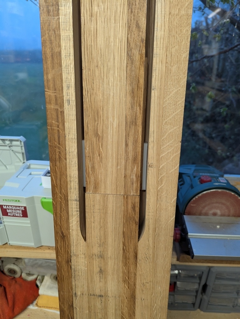 Il est divisé en trois parties : une première section de 18 cm de large accueillant la presse frontale et la presse latérale, une seconde également de 18 cm, destinée à être raccordée ultérieurement à l’aide de dominos XL, et enfin une partie amovible de 4 cm de large, servant de séparation entre la zone bois massif et la zone type MFT.