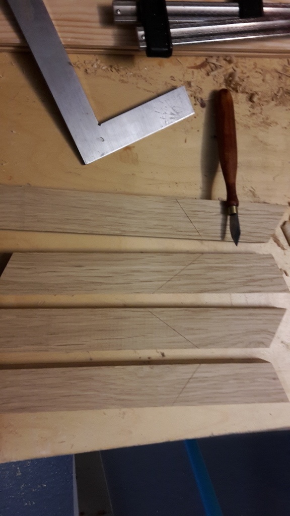 j'ai commencé par tracer à l'aide du tranchet et de l'équerre pour être le plus précis possible la largeur à évider. Pour le premier évidement de l'assemblage, j'ai tout évidé au ciseau à bois. Le moins qu'on puisse dire c'est que c'est long, le chêne c'est dur.