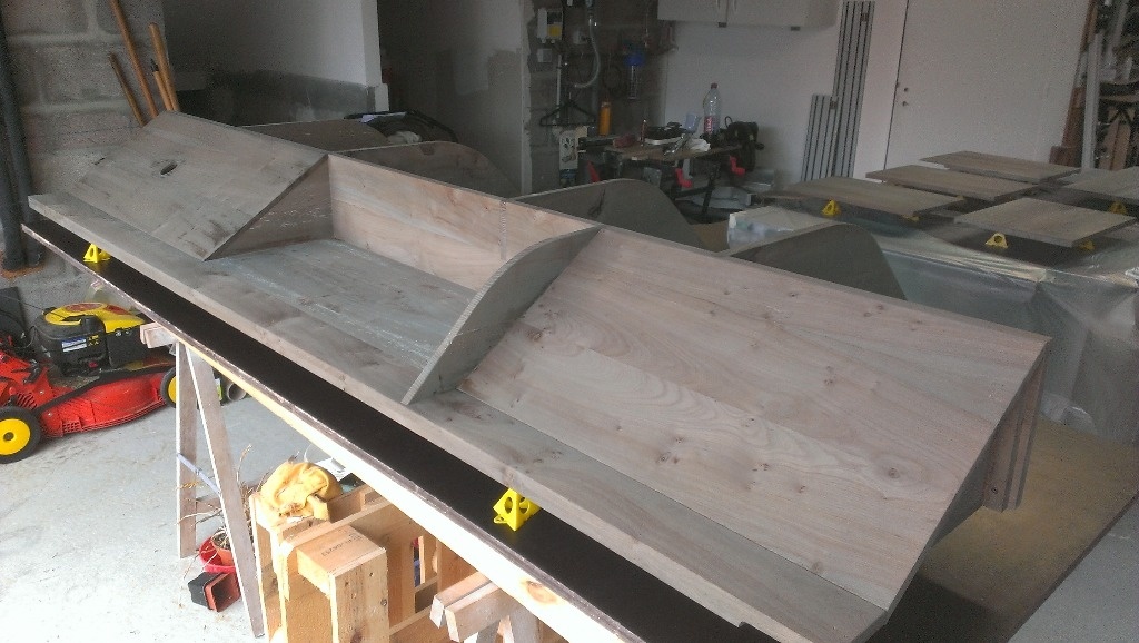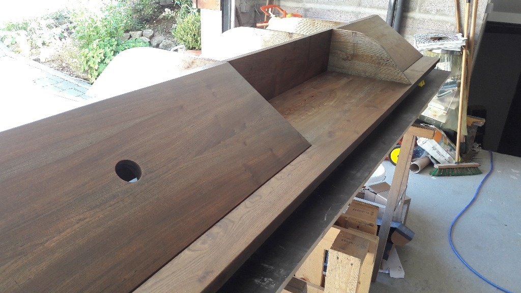 Je n'ai pas détaillé les découpes et le collage. Il n'y avait rien de bien compliqué et j'en ai oublié de prendre des photos. J'ai tout de même passé beaucoup de temps au rabot de finition et racloir pour réaliser une préparation de surface sans poncage.