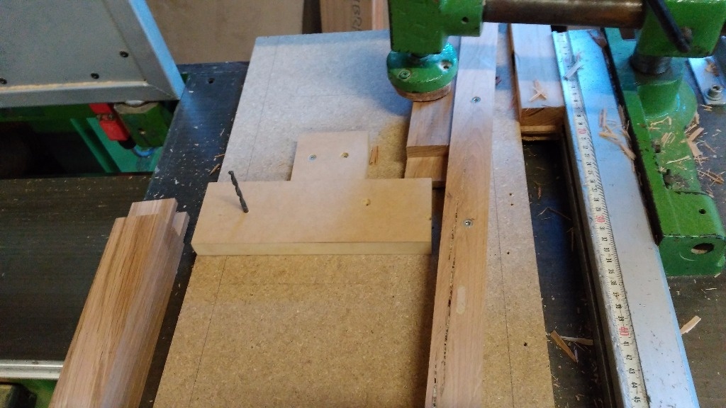 Le gabarit est constitué de deux cales en chêne de la même épaisseur que les pieds et de deux cales en contre plaqué qui servent de butée pour la longueur des mortaises.