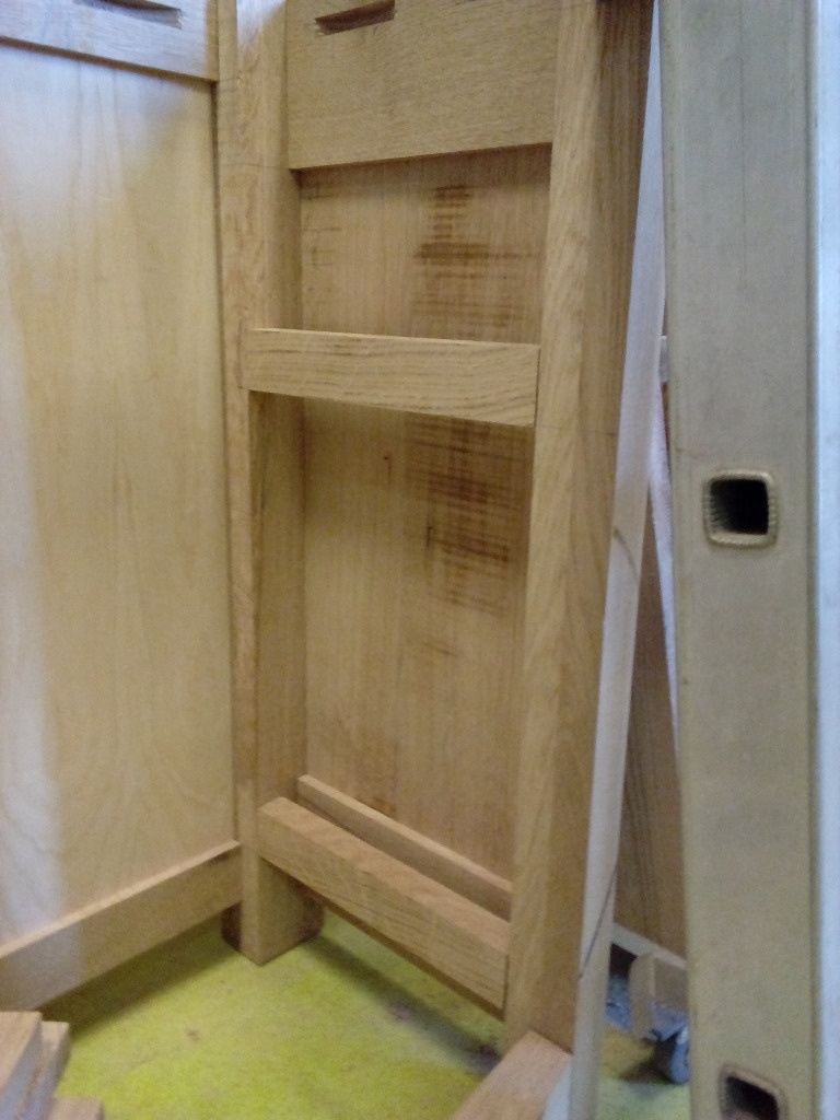 apres mise en teinte des panneaux,j'ai commencé les collages,puis le positionnement des coulisses ,la mise en place des verins de pieds reglables.
