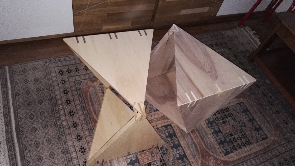 La rigidité n'étant pas terrible avec une simple clé entre les deux pointes de triangle j'ai rajouté deux renforts. Cela sera surement le point faible (même si les deux renforts apportent beaucoup). Bon une table basse en principe cela ne supportera que peux de poids.