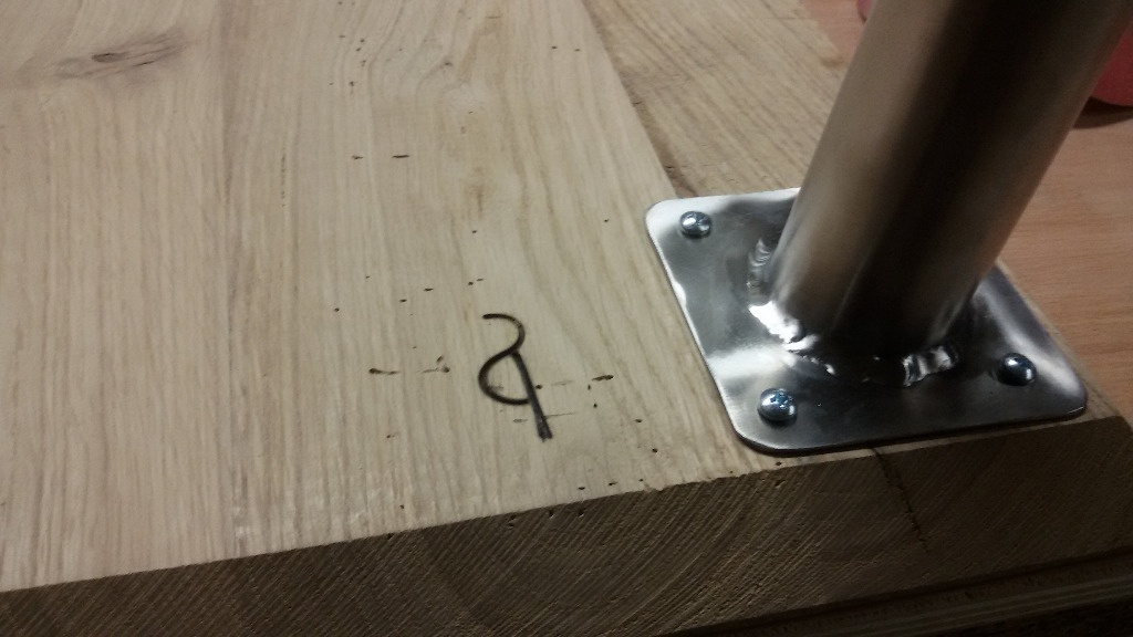 le plateau est en chêne avec une coupe a 45degre sur champs les pied sont en inox avec une inclinaison a 5degre vers l’extérieur le bas des pied est fini avec un bouchon en chêne