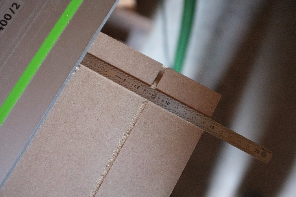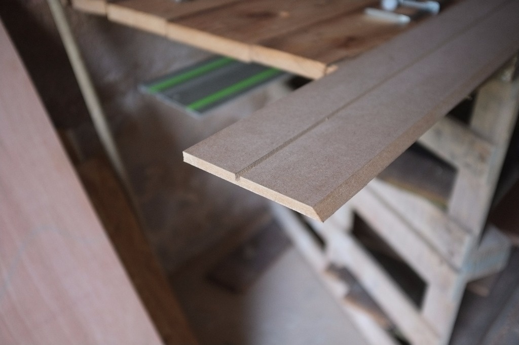 Une fois le fond découpé, je réalise dans du medium de 10mm ce qui servira pour les bords. Il s'agit de bandes de medium de 15cm de hauteur avec une rainure au milieu pour glisser le "fond" dedans, et une coupe à 45° en haut, pour le design.