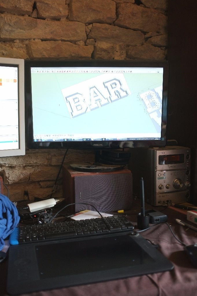 Vous trouverez un aperçu très rapide de la conception sur Sketchup, la découpe des lettres dans du contreplaqué, celle des bords dans du medium, et de l'assemblage final. N'ayant pas participé à l'étape peinture je n'ai rien là-dessus, mais on imagine bien !