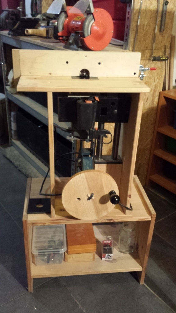 Hier soir, avant d'aller dormir je n'ai pas pu m'empêcher de faire un truc ou deux. j'ai viré le morceau de bois qui était entre la base de la défonceuse et le cric, du coup j'ai pu les assemblés avec la tige filetée qui maintien de la def au châssis. J'ai trouvé une base de plateau tournant et une vieille poignée d'une ancienne foreuse pour servir de manivelle au cric et je suis très content de l'aisance du système (je dois encore paufiner l'esthétique ). Je vais encore fixer le cric à la base du caisson et fixer un tasseau entre la base du caisson et la base du châssis comme maintien (même si ça ne bouge pas du tout avec les fixations des axes au plateau ).