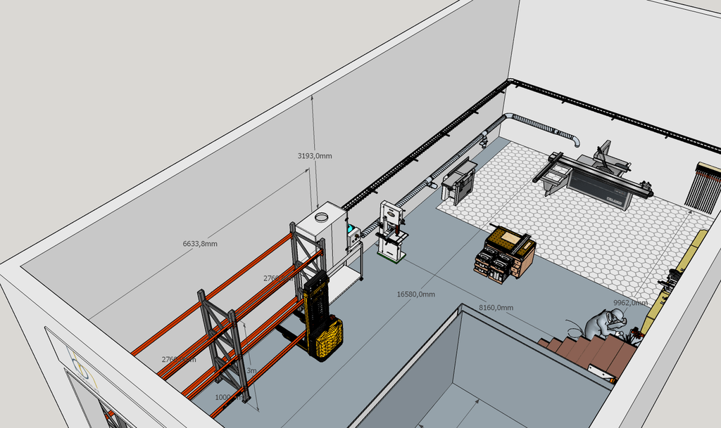 Dans un premier temps, à l’aide d’un logiciel de DAO 3D (Sketchup) j’ai modélisé les machines ainsi que leur gabarit d’encombrement standard (taille d’un panneau 250x125, hauteur d’une porte…). L’usage en dehors de ces tailles standard étant exceptionnel, chaque machine est déplaçable pour pouvoir multiplier son débattement.