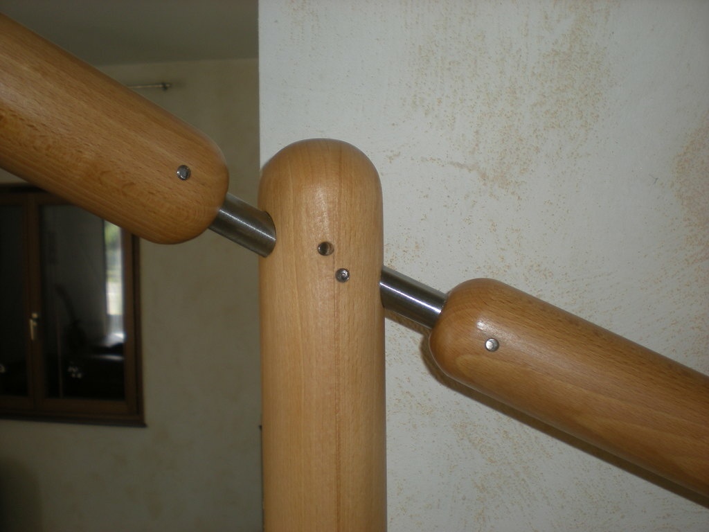 Pièce de bois à l’intérieur d'un cylindre en inox en tension par une tige filetée du sol au palier.