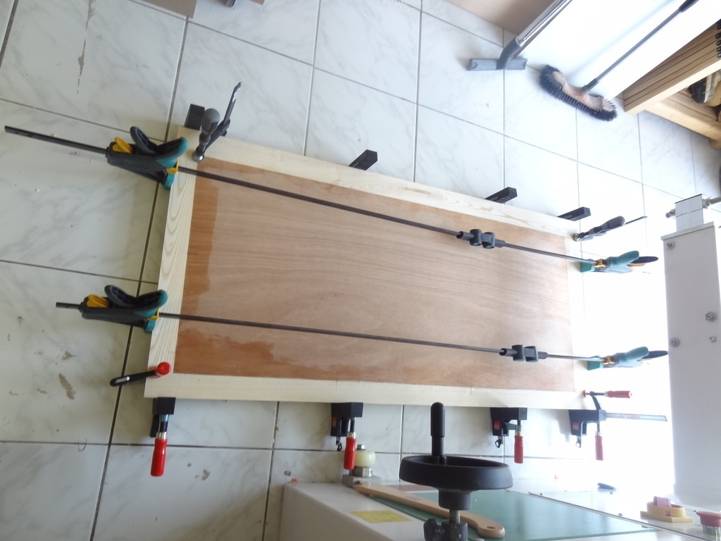 Une fois que mes panneaux de 4mm sont terminés, je vais pourvoir procéder au collage sur le contreplaqué. N'ayant pas de presse à plaquer, j'ai du improviser avec les serres joint dont je disposais.